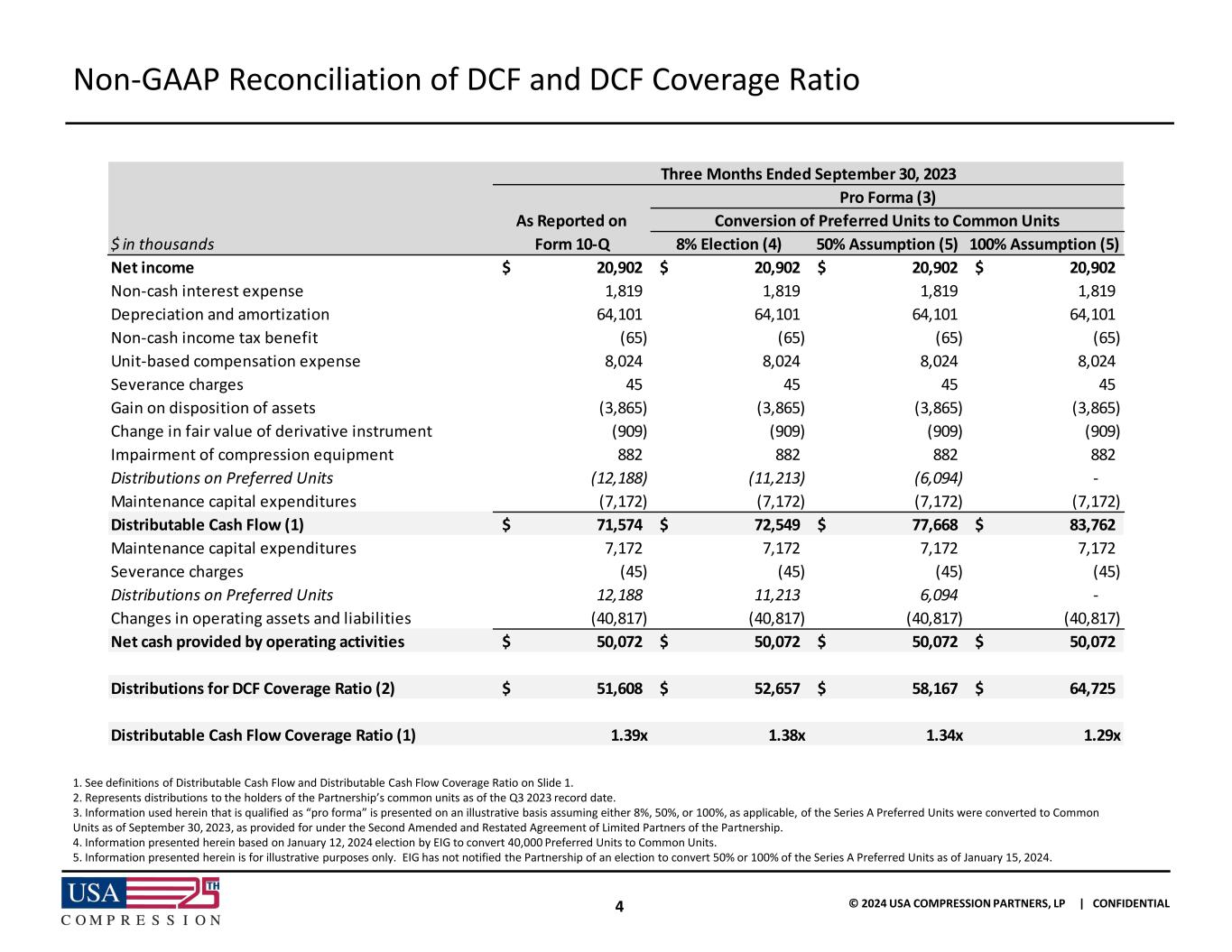 3 © 2024 USA COMPRESSION PARTNERS, LP | CONFIDENTIAL Illustrative Pro Forma Examples of Potential Preferred Unit Conversions Conversion of the Series A Preferred Units: ✓ Enhances common unitholder liquidity. ✓ Slight increase to total distributions, less than $950,000 per quarter if 100% of Preferred Units were to be converted. ✓ Modestly reduces Distributable Cash Flow Coverage Ratio. The conversion of the Preferred Units to Common Units has minimal impact on financial position ($ in thousands) 8% Election (4) 50% Assumption (5) 100% Assumption (5) Distributable Cash Flow ("DCF") (1) 71,574$ 71,574$ 71,574$ 71,574$ Pro Forma increase upon Preferred Unit Conversion - 975 6,094 12,188 Pro Forma DCF (3) 71,574$ 72,549$ 77,668$ 83,762$ Distributions for DCF Coverage Ratio (2) 51,608$ 51,608$ 51,608$ 51,608$ Pro Forma increase upon Preferred Unit Conversion - 1,049 6,559 13,117 Pro Forma Distributions for DCF Coverage Ratio (3) 51,608$ 52,657$ 58,167$ 64,725$ Pro Forma DCF Coverage Ratio (3) 1.39x 1.38x 1.34x 1.29x Three Months Ended September 30, 2023 Conversion of Preferred Units to Common UnitsAs Reported on Form 10-Q 1. See definitions of Distributable Cash Flow and Distributable Cash Flow Coverage Ratio on Slide 1. 2. Represents distributions to the holders of the Partnership’s common units as of the Q3 2023 record date. 3. Information used herein that is qualified as “pro forma” is presented on an illustrative basis assuming either 8%, 50%, or 100%, as applicable, of the Series A Preferred Units were converted to Common Units as of September 30, 2023, as provided for under the Second Amended and Restated Agreement of Limited Partners of the Partnership. 4. Information presented herein based on January 12, 2024 election by EIG to convert 40,000 Preferred Units to Common Units. 5. Information presented herein is for illustrative purposes only. EIG has not notified the Partnership of an election to convert 50% or 100% of the Series A Preferred Units as of January 15, 2024.