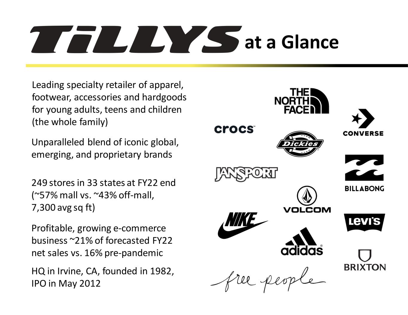Leading specialty retailer of apparel, footwear, accessories and hardgoods for young adults, teens and children (the whole family) Unparalleled blend of iconic global, emerging, and proprietary brands 249 stores in 33 states at FY22 end (~57% mall vs. ~43% off-mall, 7,300 avg sq ft) Profitable, growing e-commerce business ~21% of forecasted FY22 net sales vs. 16% pre-pandemic HQ in Irvine, CA, founded in 1982, IPO in May 2012 at a Glance