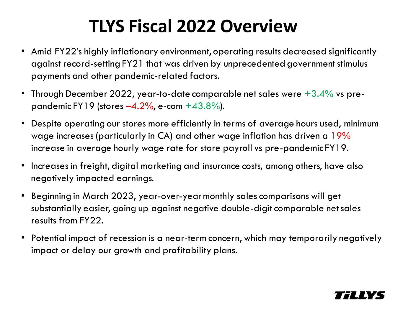 • Amid FY22’s highly inflationary environment, operating results decreased significantly against record-setting FY21 that was driven by unprecedented government stimulus payments and other pandemic-related factors. • Through December 2022, year-to-date comparable net sales were +3.4% vs pre- pandemic FY19 (stores –4.2%, e-com +43.8%). • Despite operating our stores more efficiently in terms of average hours used, minimum wage increases (particularly in CA) and other wage inflation has driven a 19% increase in average hourly wage rate for store payroll vs pre-pandemic FY19. • Increases in freight, digital marketing and insurance costs, among others, have also negatively impacted earnings. • Beginning in March 2023, year-over-year monthly sales comparisons will get substantially easier, going up against negative double-digit comparable net sales results from FY22. • Potential impact of recession is a near-term concern, which may temporarily negatively impact or delay our growth and profitability plans. TLYS Fiscal 2022 Overview
