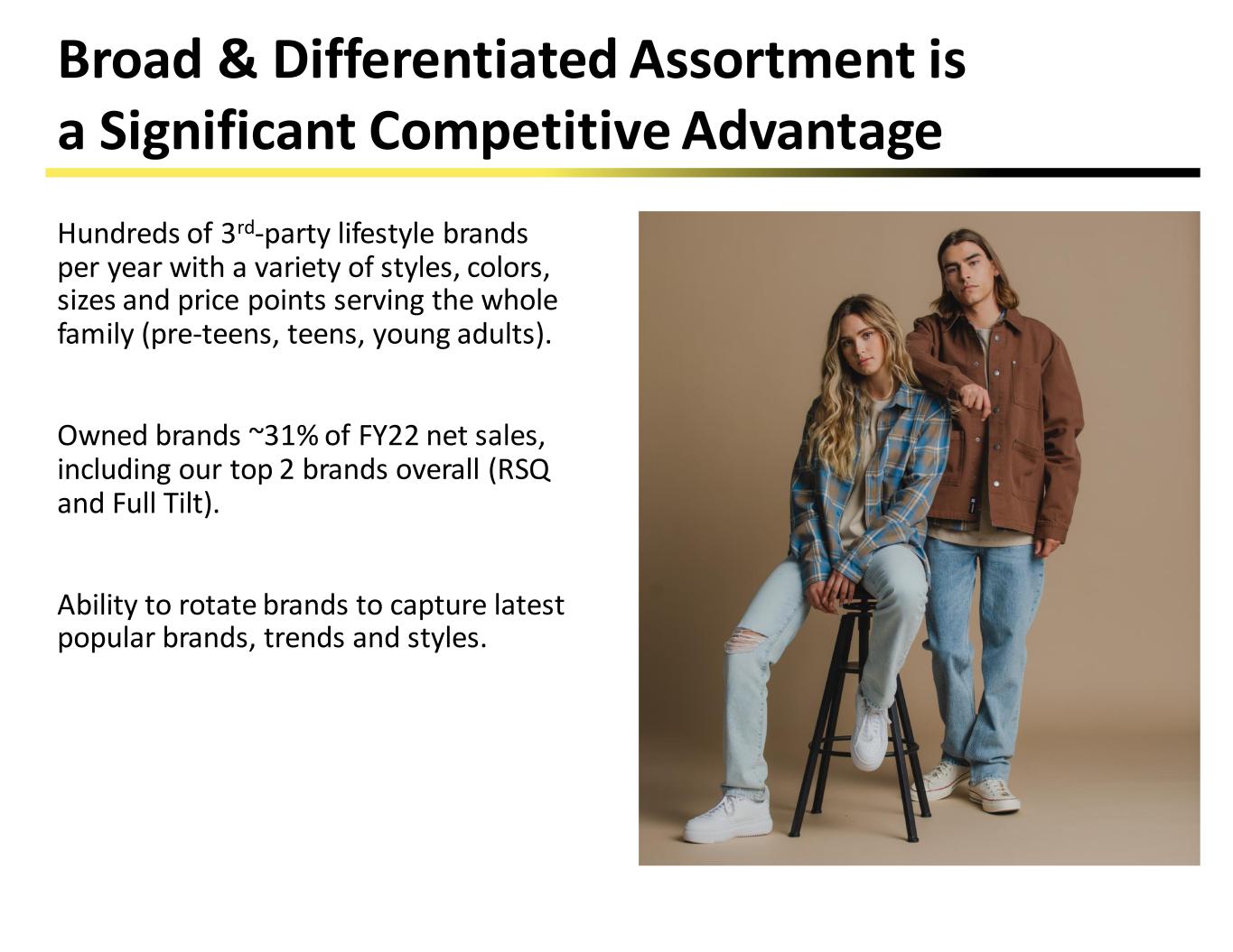 Hundreds of 3rd-party lifestyle brands per year with a variety of styles, colors, sizes and price points serving the whole family (pre-teens, teens, young adults). Owned brands ~31% of FY22 net sales, including our top 2 brands overall (RSQ and Full Tilt). Ability to rotate brands to capture latest popular brands, trends and styles. Broad & Differentiated Assortment is a Significant Competitive Advantage