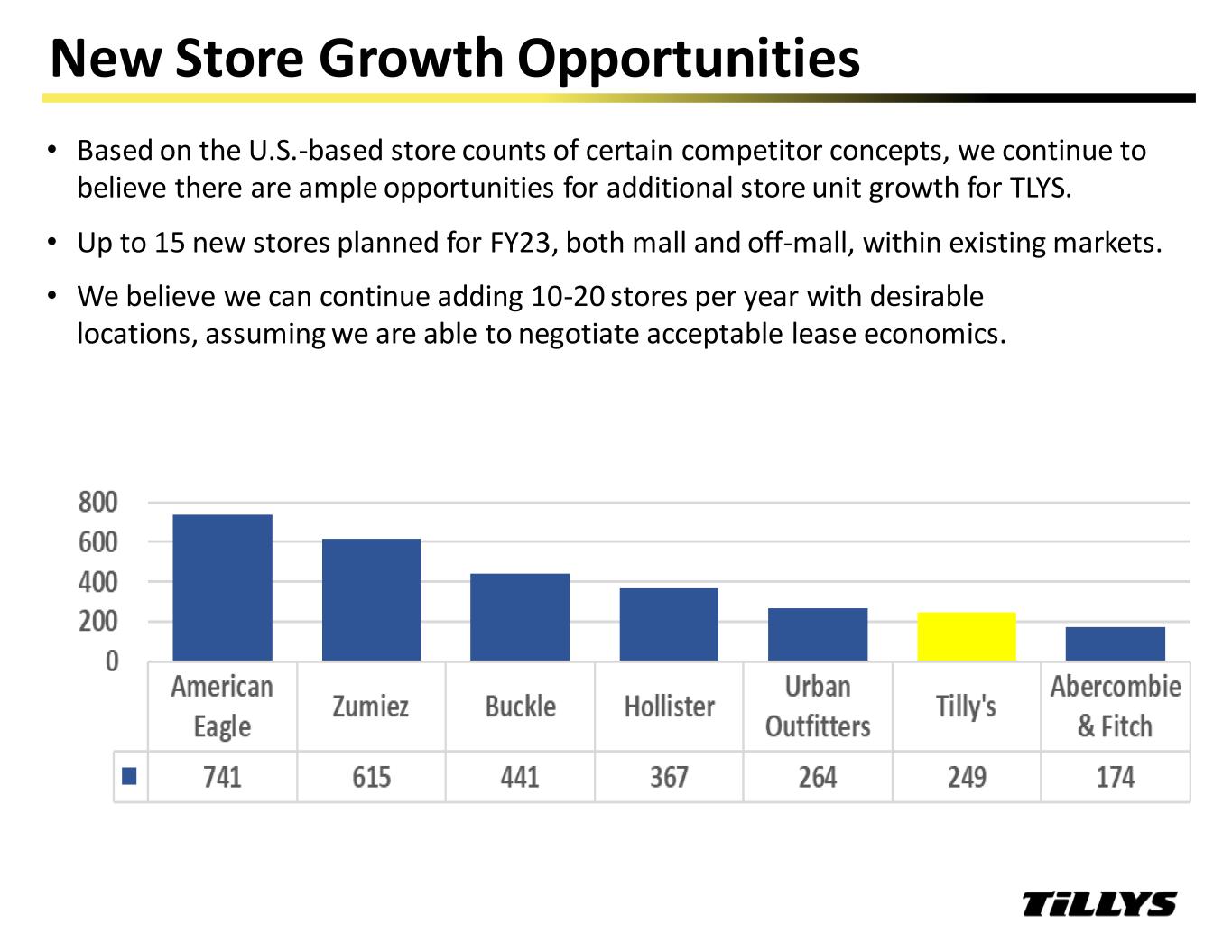 New Store Growth Opportunities • Based on the U.S.-based store counts of certain competitor concepts, we continue to believe there are ample opportunities for additional store unit growth for TLYS. • Up to 15 new stores planned for FY23, both mall and off-mall, within existing markets. • We believe we can continue adding 10-20 stores per year with desirable locations, assuming we are able to negotiate acceptable lease economics.