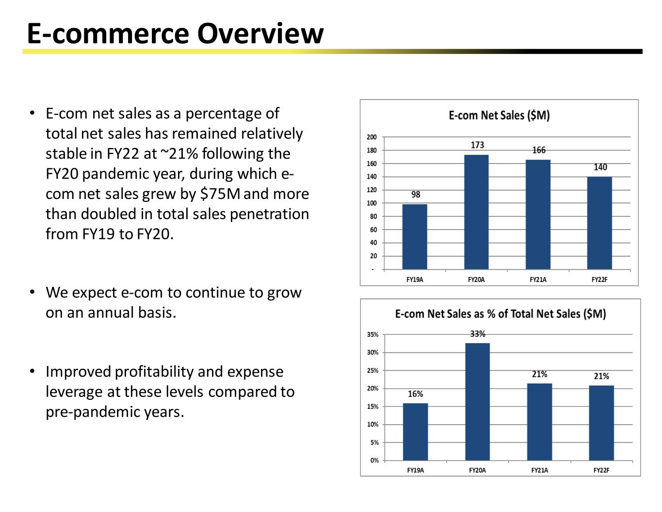 E-commerce Overview • E-com net sales as a percentage of total net sales has remained relatively stable in FY22 at ~21% following the FY20 pandemic year, during which e- com net sales grew by $75M and more than doubled in total sales penetration from FY19 to FY20. • We expect e-com to continue to grow on an annual basis. • Improved profitability and expense leverage at these levels compared to pre-pandemic years.