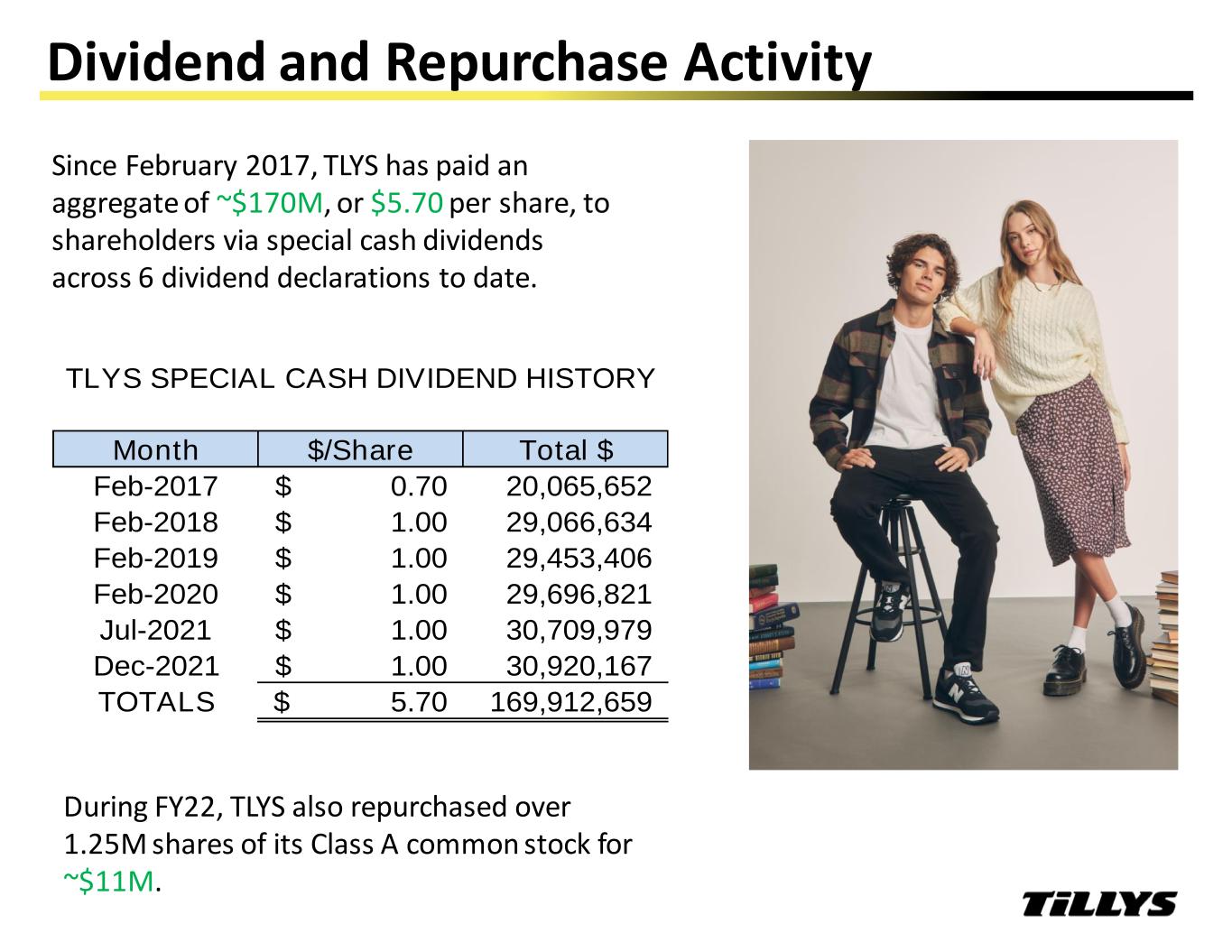 Dividend and Repurchase Activity Month $/Share Total $ Feb-2017 0.70$ 20,065,652 Feb-2018 1.00$ 29,066,634 Feb-2019 1.00$ 29,453,406 Feb-2020 1.00$ 29,696,821 Jul-2021 1.00$ 30,709,979 Dec-2021 1.00$ 30,920,167 TOTALS 5.70$ 169,912,659 TLYS SPECIAL CASH DIVIDEND HISTORY Since February 2017, TLYS has paid an aggregate of ~$170M, or $5.70 per share, to shareholders via special cash dividends across 6 dividend declarations to date. During FY22, TLYS also repurchased over 1.25M shares of its Class A common stock for ~$11M.