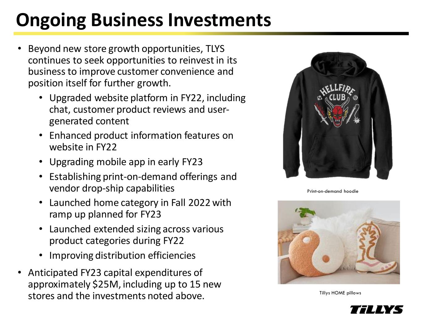 Ongoing Business Investments • Beyond new store growth opportunities, TLYS continues to seek opportunities to reinvest in its business to improve customer convenience and position itself for further growth. • Upgraded website platform in FY22, including chat, customer product reviews and user- generated content • Enhanced product information features on website in FY22 • Upgrading mobile app in early FY23 • Establishing print-on-demand offerings and vendor drop-ship capabilities • Launched home category in Fall 2022 with ramp up planned for FY23 • Launched extended sizing across various product categories during FY22 • Improving distribution efficiencies • Anticipated FY23 capital expenditures of approximately $25M, including up to 15 new stores and the investments noted above. Print-on-demand hoodie Tillys HOME pillows