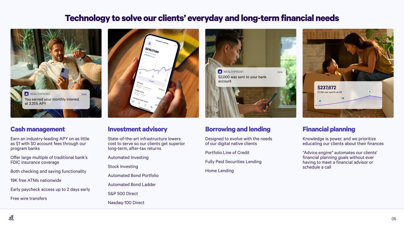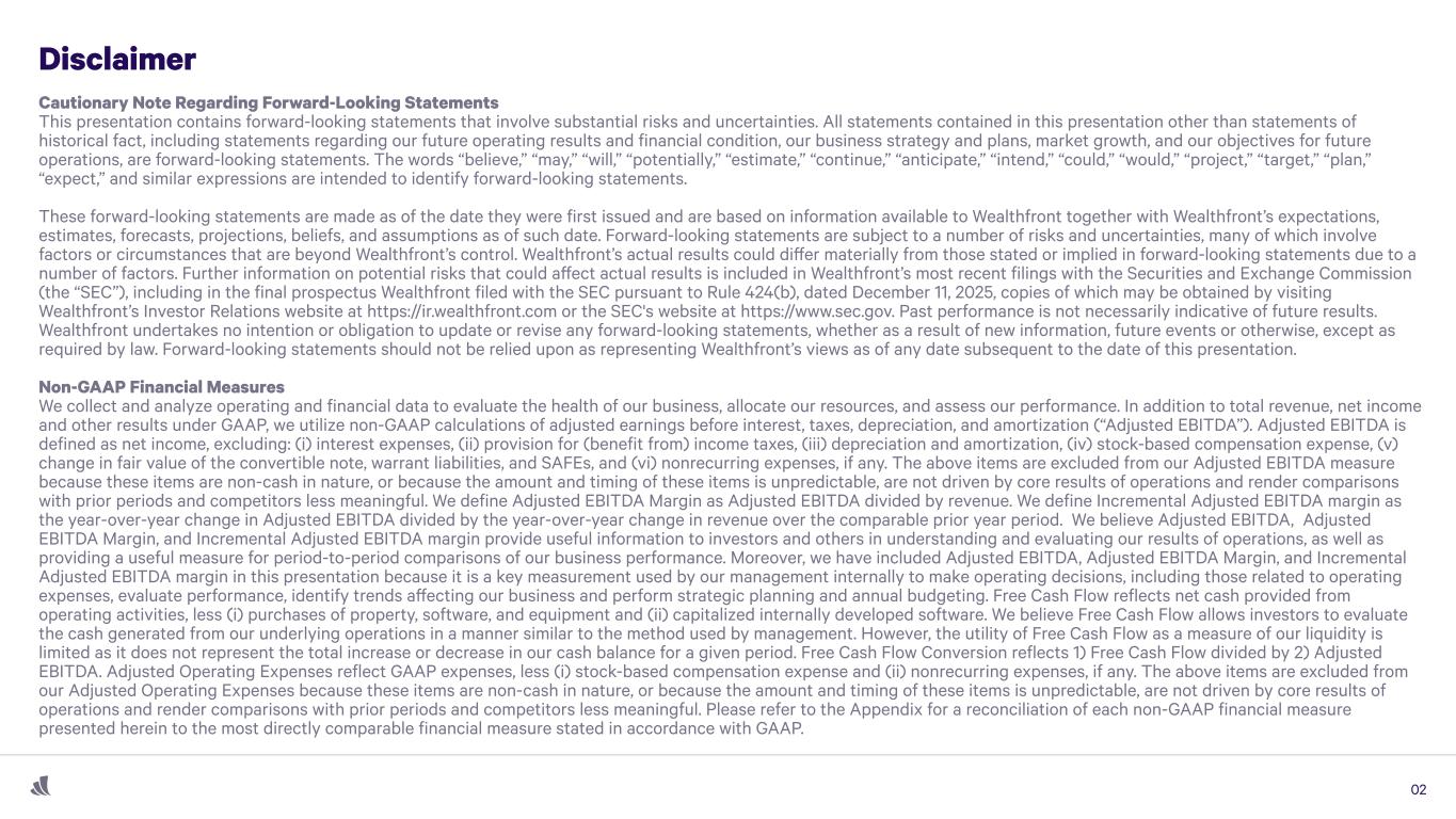 Disclaimer Cautionary Note Regarding Forward-Looking Statements This presentation contains forward-looking statements that involve substantial risks and uncertainties. All statements contained in this presentation other than statements of historical fact, including statements regarding our future operating results and financial condition, our business strategy and plans, market growth, and our objectives for future operations, are forward-looking statements. The words “believe,” “may,” “will,” “potentially,” “estimate,” “continue,” “anticipate,” “intend,” “could,” “would,” “project,” “target,” “plan,” “expect,” and similar expressions are intended to identify forward-looking statements. These forward-looking statements are made as of the date they were first issued and are based on information available to Wealthfront together with Wealthfront’s expectations, estimates, forecasts, projections, beliefs, and assumptions as of such date. Forward-looking statements are subject to a number of risks and uncertainties, many of which involve factors or circumstances that are beyond Wealthfront’s control. Wealthfront’s actual results could differ materially from those stated or implied in forward-looking statements due to a number of factors. Further information on potential risks that could affect actual results is included in Wealthfront’s most recent filings with the Securities and Exchange Commission (the “SEC”), including in the final prospectus Wealthfront filed with the SEC pursuant to Rule 424(b), dated December 11, 2025, copies of which may be obtained by visiting Wealthfront’s Investor Relations website at https://ir.wealthfront.com or the SEC's website at https://www.sec.gov. Past performance is not necessarily indicative of future results. Wealthfront undertakes no intention or obligation to update or revise any forward-looking statements, whether as a result of new information, future events or otherwise, except as required by law. Forward-looking statements should not be relied upon as representing Wealthfront’s views as of any date subsequent to the date of this presentation. Non-GAAP Financial Measures We collect and analyze operating and financial data to evaluate the health of our business, allocate our resources, and assess our performance. In addition to total revenue, net income and other results under GAAP, we utilize non-GAAP calculations of adjusted earnings before interest, taxes, depreciation, and amortization (“Adjusted EBITDA”). Adjusted EBITDA is defined as net income, excluding: (i) interest expenses, (ii) provision for (benefit from) income taxes, (iii) depreciation and amortization, (iv) stock-based compensation expense, (v) change in fair value of the convertible note, warrant liabilities, and SAFEs, and (vi) nonrecurring expenses, if any. The above items are excluded from our Adjusted EBITDA measure because these items are non-cash in nature, or because the amount and timing of these items is unpredictable, are not driven by core results of operations and render comparisons with prior periods and competitors less meaningful. We define Adjusted EBITDA Margin as Adjusted EBITDA divided by revenue. We define Incremental Adjusted EBITDA margin as the year-over-year change in Adjusted EBITDA divided by the year-over-year change in revenue over the comparable prior year period. We believe Adjusted EBITDA, Adjusted EBITDA Margin, and Incremental Adjusted EBITDA margin provide useful information to investors and others in understanding and evaluating our results of operations, as well as providing a useful measure for period-to-period comparisons of our business performance. Moreover, we have included Adjusted EBITDA, Adjusted EBITDA Margin, and Incremental Adjusted EBITDA margin in this presentation because it is a key measurement used by our management internally to make operating decisions, including those related to operating expenses, evaluate performance, identify trends affecting our business and perform strategic planning and annual budgeting. Free Cash Flow reflects net cash provided from operating activities, less (i) purchases of property, software, and equipment and (ii) capitalized internally developed software. We believe Free Cash Flow allows investors to evaluate the cash generated from our underlying operations in a manner similar to the method used by management. However, the utility of Free Cash Flow as a measure of our liquidity is limited as it does not represent the total increase or decrease in our cash balance for a given period. Free Cash Flow Conversion reflects 1) Free Cash Flow divided by 2) Adjusted EBITDA. Adjusted Operating Expenses reflect GAAP expenses, less (i) stock-based compensation expense and (ii) nonrecurring expenses, if any. The above items are excluded from our Adjusted Operating Expenses because these items are non-cash in nature, or because the amount and timing of these items is unpredictable, are not driven by core results of operations and render comparisons with prior periods and competitors less meaningful. Please refer to the Appendix for a reconciliation of each non-GAAP financial measure presented herein to the most directly comparable financial measure stated in accordance with GAAP. 02