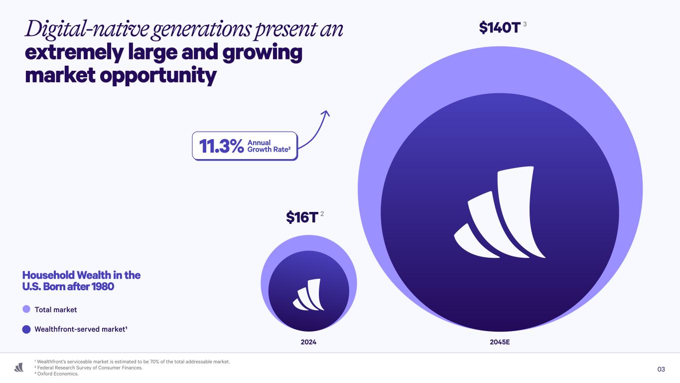 Household Wealth in the U.S. Born after 1980 Digital-native generations present an extremely large and growing market opportunity Total market Wealthfront-served market1 11.3% Annual Growth Rate2 2045E2024 $16T 2 $140T 3 1 Wealthfront’s serviceable market is estimated to be 70% of the total addressable market.