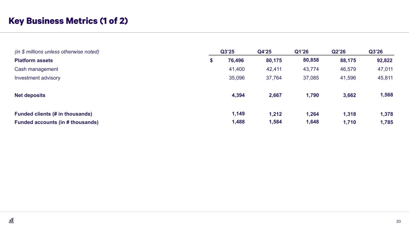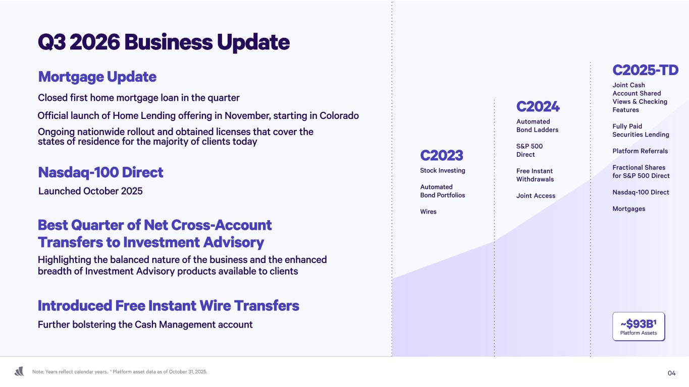 Transfers to Investment Advisory Closed first home mortgage loan in the quarter Launched October 2025 Highlighting the balanced nature of the business and the enhanced breadth of Investment Advisory products available to clients Introduced Free Instant Wire Transfers Further bolstering the Cash Management account Ongoing nationwide rollout and obtained licenses that cover the states of residence for the majority of clients today Official launch of Home Lending offering in November, starting in Colorado C2024 Automated Bond Ladders S&P 500 Direct Free Instant Withdrawals Joint Access C2023 Stock Investing Automated Bond Portfolios Wires C2025-TD Joint Cash Account Shared Views & Checking Features Fully Paid Securities Lending Platform Referrals Fractional Shares for S&P 500 Direct