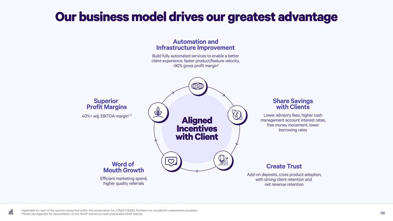 Our business model drives our greatest advantage Automation and Infrastructure Improvement Build fully automated services to enable a better client experience, faster product/feature velocity, ~90% gross profit margin1 Share Savings with Clients Lower advisory fees, higher cash management account interest rates, free money movement, lower borrowing rates Superior