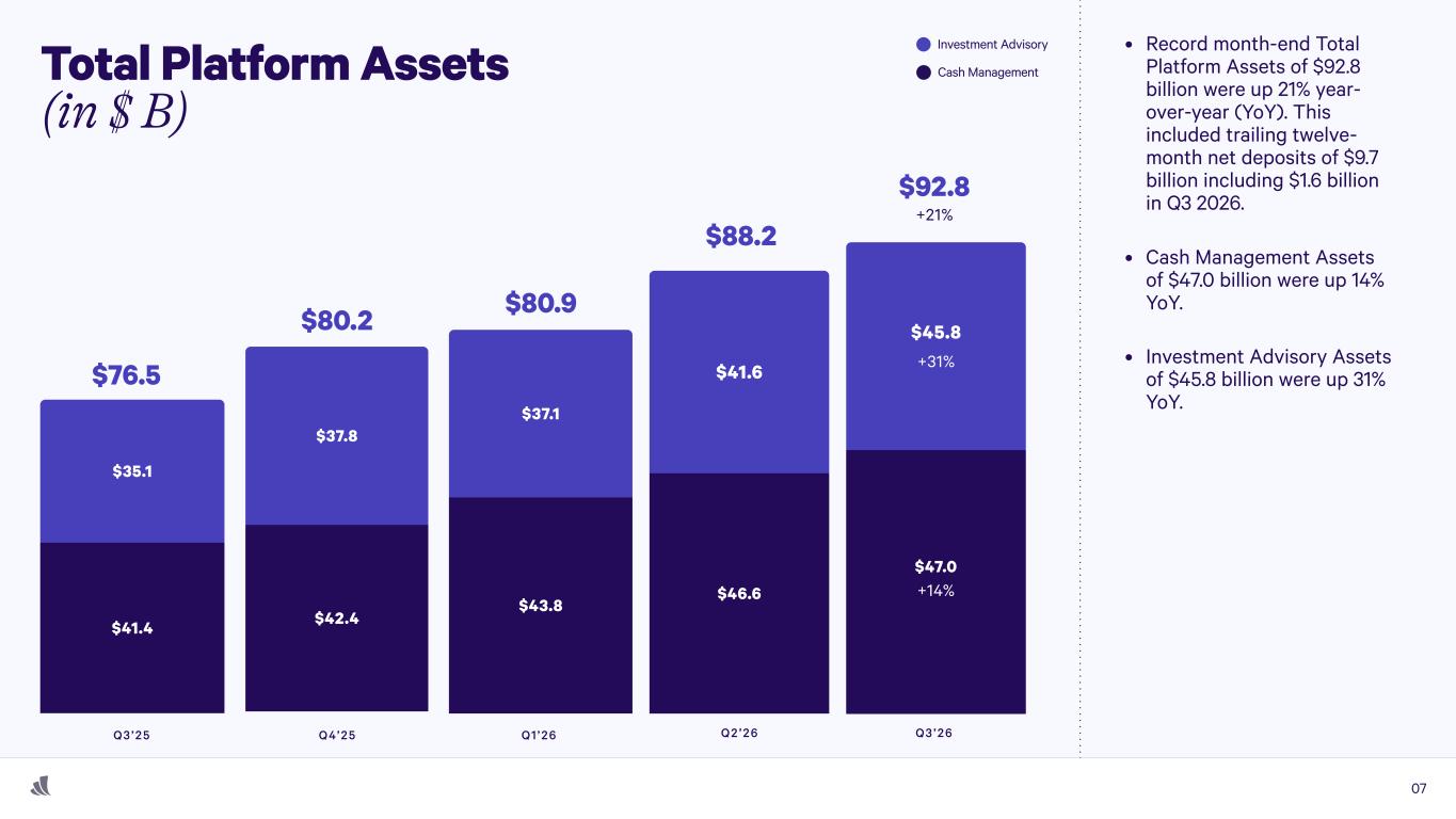 Total Platform Assets (in $ B) Record month-end Total Platform Assets of $92.8 billion were up 21% year- over-year (YoY). This included trailing twelve- month net deposits of $9.7 billion including $1.6 billion in Q3 2026. Cash Management Assets of $47.0 billion were up 14% YoY. Investment Advisory Assets of $45.8 billion were up 31% YoY. Investment Advisory Cash Management Q3 ’25 $76.5 $35.1 $41.4 Q4’25 Q1 ’26 $80.2 $80.9 $37.8 $42.4 $37.1 $43.8 Q2 ’26 Q3 ’26 $88.2 $92.8 $41.6 $46.6 $45.8 +31% $47.0 +14% +21% 07