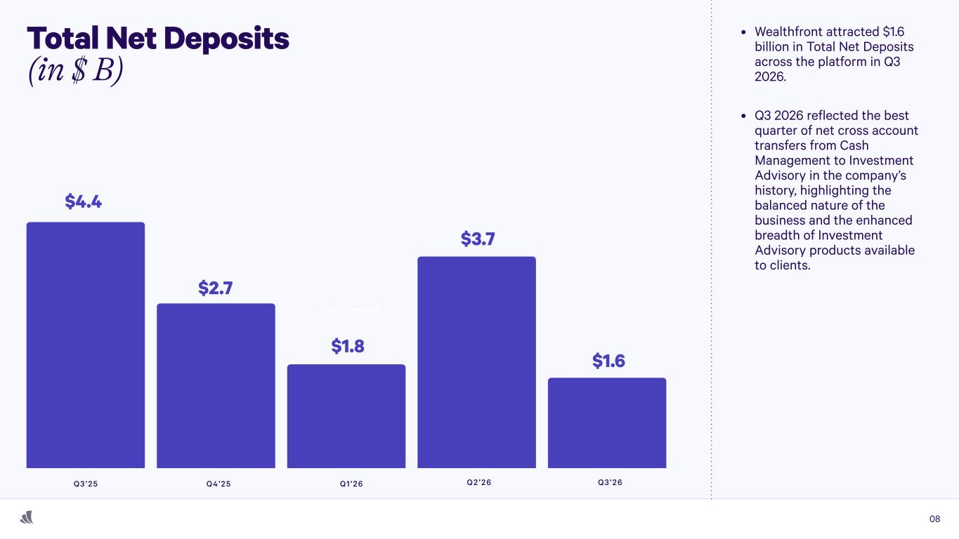 Total Net Deposits (in $ B) (14x Increase) $4.4 $2.7 $1.8 $3.7 $1.6 Wealthfront attracted $1.6 billion in Total Net Deposits across the platform in Q3 2026. Q3 2026 reflected the best quarter of net cross account transfers from Cash Management to Investment Advisory in the company’s history, highlighting the balanced nature of the business and the enhanced breadth of Investment Advisory products available to clients. Q3 ’25 Q4’25 Q1 ’26 Q2 ’26 Q3 ’26 08