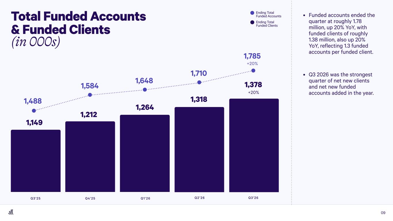 Total Funded Accounts & Funded Clients (in 000s) +20% +20% 1,378 1,149 1,488 1,584 1,648 1,710 1,785 1,212 1,264 1,318 Funded accounts ended the quarter at roughly 1.78 million, up 20% YoY, with funded clients of roughly 1.38 million, also up 20% YoY, reflecting 1.3 funded accounts per funded client. Q3 2026 was the strongest quarter of net new clients and net new funded accounts added in the year. Ending Total Funded Accounts Ending Total Funded Clients Q3 ’25 Q4’25 Q1 ’26 Q2 ’26 Q3 ’26 09