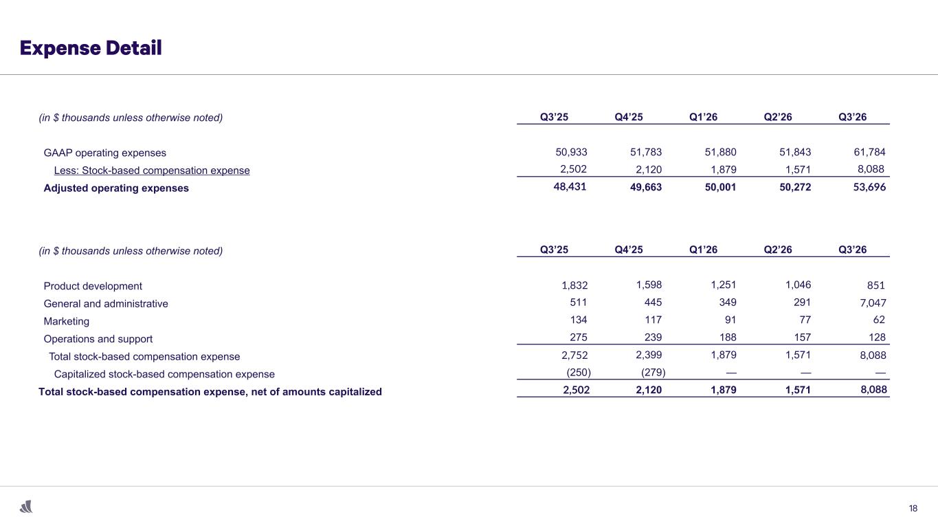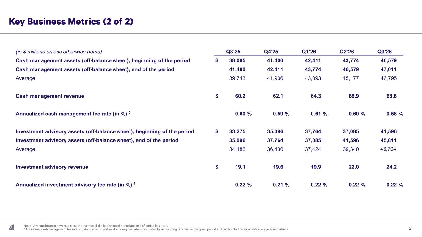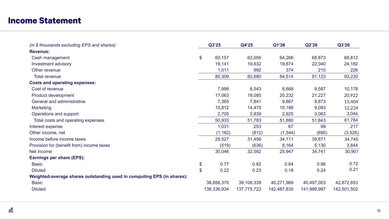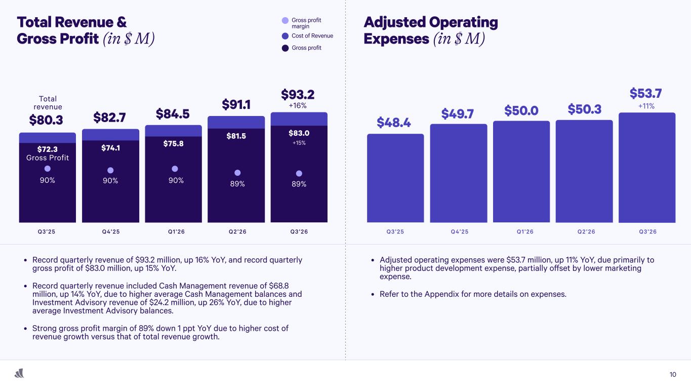 90% $72.3 90% $74.1 90% $75.8 $81.5 89% $83.0 +15% 89% $80.3 $48.4$82.7 $49.7$84.5 $50.0$91.1 $50.3 $93.2 $53.7 Q3 ’25 Q4’25 Q1 ’26 Q2 ’26 Q3 ’26 Total revenue +16% +11% Q3 ’25 Q4’25 Q1 ’26 Q2 ’26 Q3 ’26 Gross Profit Record quarterly revenue of $93.2 million, up 16% YoY, and record quarterly gross profit of $83.0 million, up 15% YoY. Record quarterly revenue included Cash Management revenue of $68.8 million, up 14% YoY, due to higher average Cash Management balances and Investment Advisory revenue of $24.2 million, up 26% YoY, due to higher average Investment Advisory balances. Strong gross profit margin of 89% down 1 ppt YoY due to higher cost of revenue growth versus that of total revenue growth. Adjusted operating expenses were $53.7 million, up 11% YoY, due primarily to higher product development expense, partially offset by lower marketing expense. Refer to the Appendix for more details on expenses. Total Revenue & Gross Profit (in $ M) Adjusted Operating