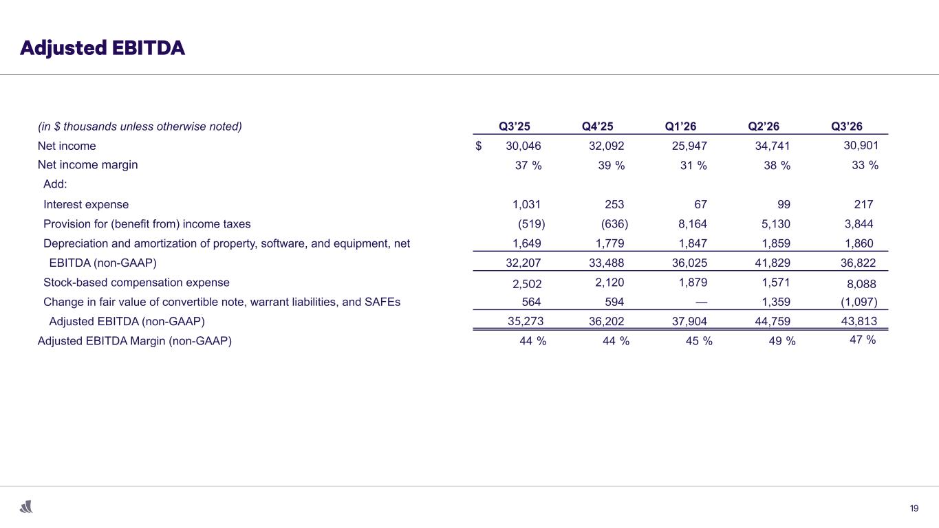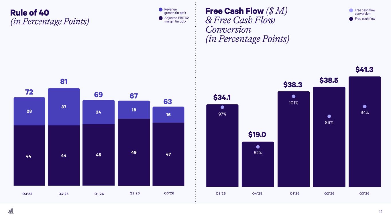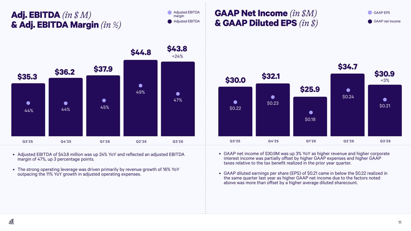 Adjusted EBITDA of $43.8 million was up 24% YoY and reflected an adjusted EBITDA margin of 47%, up 3 percentage points. The strong operating leverage was driven primarily by revenue growth of 16% YoY outpacing the 11% YoY growth in adjusted operating expenses. GAAP net income of $30.9M was up 3% YoY as higher revenue and higher corporate interest income was partially offset by higher GAAP expenses and higher GAAP taxes relative to the tax benefit realized in the prior year quarter. GAAP diluted earnings per share (EPS) of $0.21 came in below the $0.22 realized in the same quarter last year as higher GAAP net income due to the factors noted above was more than offset by a higher average diluted sharecount. 44% 44% $0.23 $0.2245% $0.18 49% $0.24 47% $0.21 $35.3 $36.2 $32.1$30.0 $37.9 $25.9 $44.8 $34.7 $43.8 $30.9 +24% +3% Q3 ’25 Q3 ’25Q4’25 Q4’25Q1 ’26 Q1 ’26Q2 ’26 Q2 ’26Q3 ’26 Q3 ’26 Adjusted EBITDA margin Adjusted EBITDA GAAP EPS GAAP net income Adj. EBITDA (in $ M) & Adj. EBITDA Margin (in %) GAAP Net Income (in $M) & GAAP Diluted EPS (in $) 11