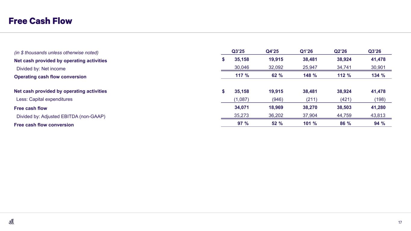 (in Percentage Points) Free cash flow conversion Free cash flow Q3 ’25 Q4’25 Q1 ’26 Q2 ’26 Q3 ’26 12 81 72 37 44 69 28 44 67 63 24 45 18 49 16 47 Q2 ’26 Q3 ’26Q3 ’25 Q4’25 Q1 ’26 Revenue growth (in ppt) Adjusted EBITDA margin (in ppt)