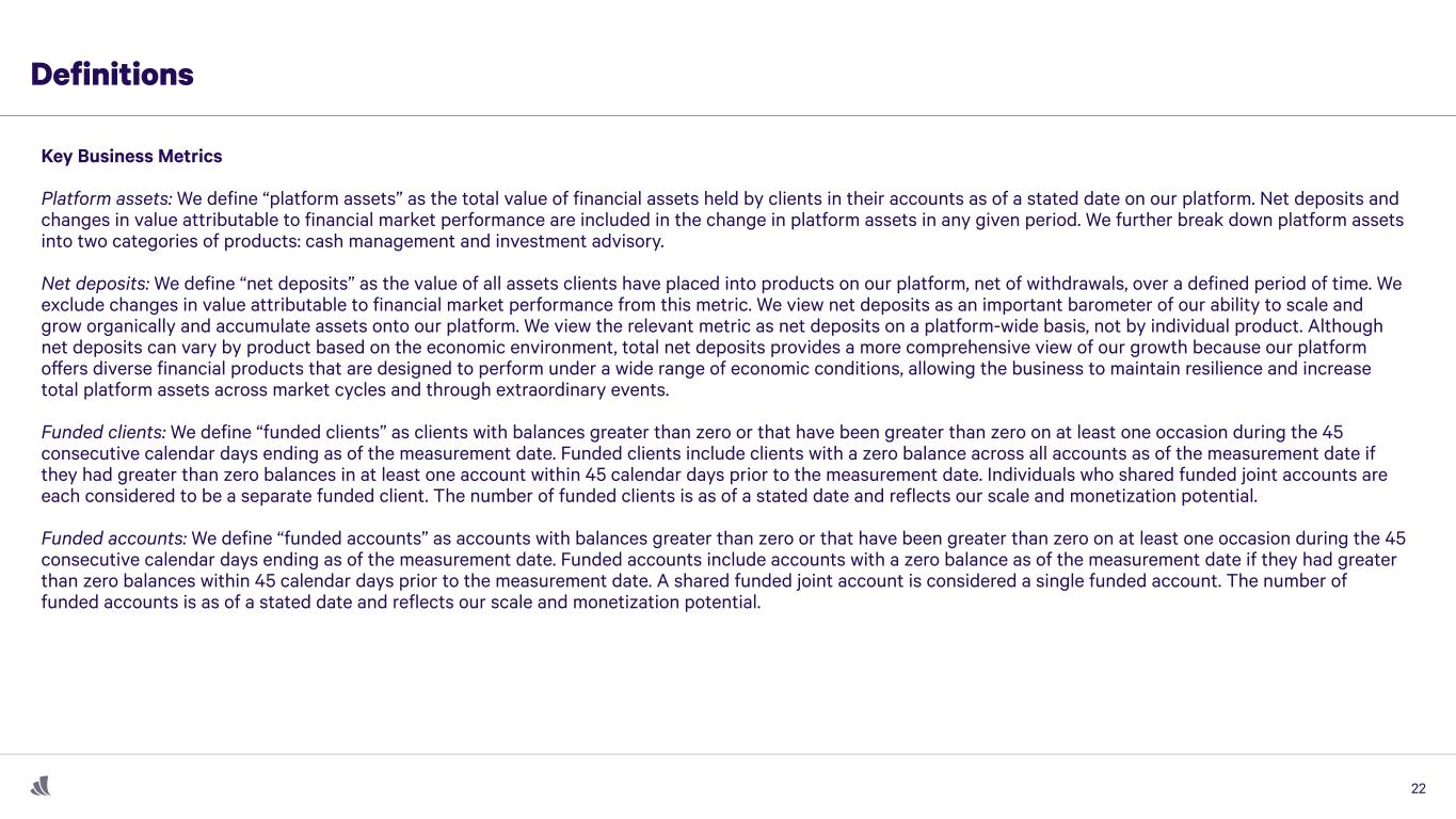Definitions Key Business Metrics Platform assets: We define “platform assets” as the total value of financial assets held by clients in their accounts as of a stated date on our platform. Net deposits and changes in value attributable to financial market performance are included in the change in platform assets in any given period. We further break down platform assets into two categories of products: cash management and investment advisory. Net deposits: We define “net deposits” as the value of all assets clients have placed into products on our platform, net of withdrawals, over a defined period of time. We exclude changes in value attributable to financial market performance from this metric. We view net deposits as an important barometer of our ability to scale and grow organically and accumulate assets onto our platform. We view the relevant metric as net deposits on a platform-wide basis, not by individual product. Although net deposits can vary by product based on the economic environment, total net deposits provides a more comprehensive view of our growth because our platform offers diverse financial products that are designed to perform under a wide range of economic conditions, allowing the business to maintain resilience and increase total platform assets across market cycles and through extraordinary events. Funded clients: We define “funded clients” as clients with balances greater than zero or that have been greater than zero on at least one occasion during the 45 consecutive calendar days ending as of the measurement date. Funded clients include clients with a zero balance across all accounts as of the measurement date if they had greater than zero balances in at least one account within 45 calendar days prior to the measurement date. Individuals who shared funded joint accounts are each considered to be a separate funded client. The number of funded clients is as of a stated date and reflects our scale and monetization potential. Funded accounts: We define “funded accounts” as accounts with balances greater than zero or that have been greater than zero on at least one occasion during the 45 consecutive calendar days ending as of the measurement date. Funded accounts include accounts with a zero balance as of the measurement date if they had greater than zero balances within 45 calendar days prior to the measurement date. A shared funded joint account is considered a single funded account. The number of funded accounts is as of a stated date and reflects our scale and monetization potential. 22