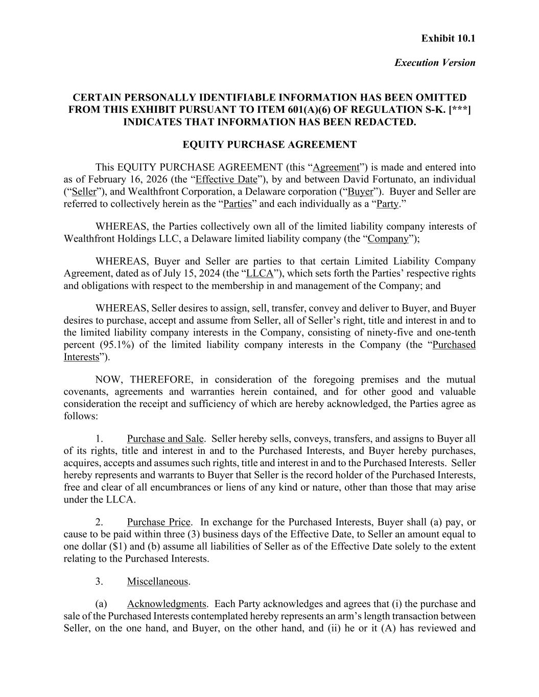 Exhibit 10.1 Execution Version CERTAIN PERSONALLY IDENTIFIABLE INFORMATION HAS BEEN OMITTED FROM THIS EXHIBIT PURSUANT TO ITEM 601(A)(6) OF REGULATION S-K. [***] INDICATES THAT INFORMATION HAS BEEN REDACTED. EQUITY PURCHASE AGREEMENT This EQUITY PURCHASE AGREEMENT (this “Agreement”) is made and entered into as of February 16, 2026 (the “Effective Date”), by and between David Fortunato, an individual (“Seller”), and Wealthfront Corporation, a Delaware corporation (“Buyer”). Buyer and Seller are referred to collectively herein as the “Parties” and each individually as a “Party.” WHEREAS, the Parties collectively own all of the limited liability company interests of Wealthfront Holdings LLC, a Delaware limited liability company (the “Company”); WHEREAS, Buyer and Seller are parties to that certain Limited Liability Company Agreement, dated as of July 15, 2024 (the “LLCA”), which sets forth the Parties’ respective rights and obligations with respect to the membership in and management of the Company; and WHEREAS, Seller desires to assign, sell, transfer, convey and deliver to Buyer, and Buyer desires to purchase, accept and assume from Seller, all of Seller’s right, title and interest in and to the limited liability company interests in the Company, consisting of ninety-five and one-tenth percent (95.1%) of the limited liability company interests in the Company (the “Purchased Interests”). NOW, THEREFORE, in consideration of the foregoing premises and the mutual covenants, agreements and warranties herein contained, and for other good and valuable consideration the receipt and sufficiency of which are hereby acknowledged, the Parties agree as follows: 1. Purchase and Sale. Seller hereby sells, conveys, transfers, and assigns to Buyer all of its rights, title and interest in and to the Purchased Interests, and Buyer hereby purchases, acquires, accepts and assumes such rights, title and interest in and to the Purchased Interests. Seller hereby represents and warrants to Buyer that Seller is the record holder of the Purchased Interests, free and clear of all encumbrances or liens of any kind or nature, other than those that may arise under the LLCA. 2. Purchase Price. In exchange for the Purchased Interests, Buyer shall (a) pay, or cause to be paid within three (3) business days of the Effective Date, to Seller an amount equal to one dollar ($1) and (b) assume all liabilities of Seller as of the Effective Date solely to the extent relating to the Purchased Interests. 3. Miscellaneous. (a) Acknowledgments. Each Party acknowledges and agrees that (i) the purchase and sale of the Purchased Interests contemplated hereby represents an arm’s length transaction between Seller, on the one hand, and Buyer, on the other hand, and (ii) he or it (A) has reviewed and