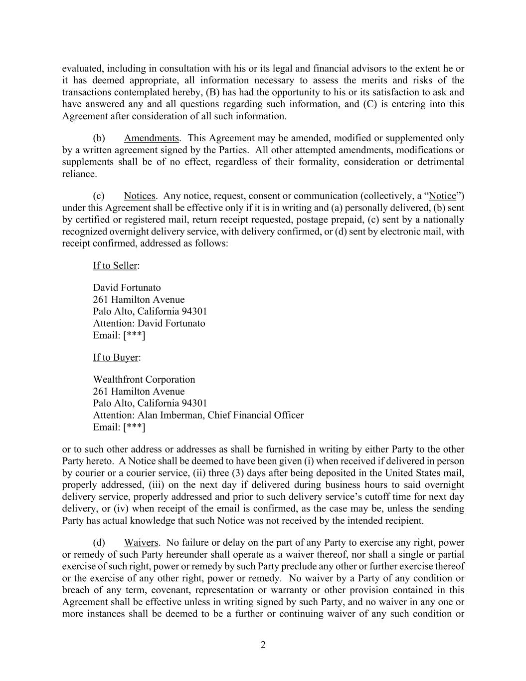 2 evaluated, including in consultation with his or its legal and financial advisors to the extent he or it has deemed appropriate, all information necessary to assess the merits and risks of the transactions contemplated hereby, (B) has had the opportunity to his or its satisfaction to ask and have answered any and all questions regarding such information, and (C) is entering into this Agreement after consideration of all such information. (b) Amendments. This Agreement may be amended, modified or supplemented only by a written agreement signed by the Parties. All other attempted amendments, modifications or supplements shall be of no effect, regardless of their formality, consideration or detrimental reliance. (c) Notices. Any notice, request, consent or communication (collectively, a “Notice”) under this Agreement shall be effective only if it is in writing and (a) personally delivered, (b) sent by certified or registered mail, return receipt requested, postage prepaid, (c) sent by a nationally recognized overnight delivery service, with delivery confirmed, or (d) sent by electronic mail, with receipt confirmed, addressed as follows: If to Seller: David Fortunato 261 Hamilton Avenue Palo Alto, California 94301 Attention: David Fortunato Email: [***] If to Buyer: Wealthfront Corporation 261 Hamilton Avenue Palo Alto, California 94301 Attention: Alan Imberman, Chief Financial Officer Email: [***] or to such other address or addresses as shall be furnished in writing by either Party to the other Party hereto. A Notice shall be deemed to have been given (i) when received if delivered in person by courier or a courier service, (ii) three (3) days after being deposited in the United States mail, properly addressed, (iii) on the next day if delivered during business hours to said overnight delivery service, properly addressed and prior to such delivery service’s cutoff time for next day delivery, or (iv) when receipt of the email is confirmed, as the case may be, unless the sending Party has actual knowledge that such Notice was not received by the intended recipient. (d) Waivers. No failure or delay on the part of any Party to exercise any right, power or remedy of such Party hereunder shall operate as a waiver thereof, nor shall a single or partial exercise of such right, power or remedy by such Party preclude any other or further exercise thereof or the exercise of any other right, power or remedy. No waiver by a Party of any condition or breach of any term, covenant, representation or warranty or other provision contained in this Agreement shall be effective unless in writing signed by such Party, and no waiver in any one or more instances shall be deemed to be a further or continuing waiver of any such condition or