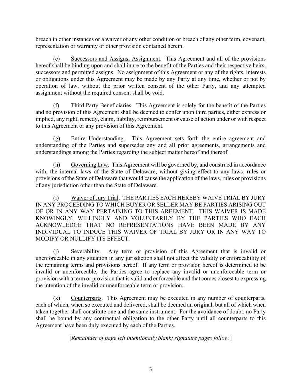 3 breach in other instances or a waiver of any other condition or breach of any other term, covenant, representation or warranty or other provision contained herein. (e) Successors and Assigns; Assignment. This Agreement and all of the provisions hereof shall be binding upon and shall inure to the benefit of the Parties and their respective heirs, successors and permitted assigns. No assignment of this Agreement or any of the rights, interests or obligations under this Agreement may be made by any Party at any time, whether or not by operation of law, without the prior written consent of the other Party, and any attempted assignment without the required consent shall be void. (f) Third Party Beneficiaries. This Agreement is solely for the benefit of the Parties and no provision of this Agreement shall be deemed to confer upon third parties, either express or implied, any right, remedy, claim, liability, reimbursement or cause of action under or with respect to this Agreement or any provision of this Agreement. (g) Entire Understanding. This Agreement sets forth the entire agreement and understanding of the Parties and supersedes any and all prior agreements, arrangements and understandings among the Parties regarding the subject matter hereof and thereof. (h) Governing Law. This Agreement will be governed by, and construed in accordance with, the internal laws of the State of Delaware, without giving effect to any laws, rules or provisions of the State of Delaware that would cause the application of the laws, rules or provisions of any jurisdiction other than the State of Delaware. (i) Waiver of Jury Trial. THE PARTIES EACH HEREBY WAIVE TRIAL BY JURY IN ANY PROCEEDING TO WHICH BUYER OR SELLER MAY BE PARTIES ARISING OUT OF OR IN ANY WAY PERTAINING TO THIS AREEMENT. THIS WAIVER IS MADE KNOWINGLY, WILLINGLY AND VOLUNTARILY BY THE PARTIES WHO EACH ACKNOWLEDGE THAT NO REPRESENTATIONS HAVE BEEN MADE BY ANY INDIVIDUAL TO INDUCE THIS WAIVER OF TRIAL BY JURY OR IN ANY WAY TO MODIFY OR NULLIFY ITS EFFECT. (j) Severability. Any term or provision of this Agreement that is invalid or unenforceable in any situation in any jurisdiction shall not affect the validity or enforceability of the remaining terms and provisions hereof. If any term or provision hereof is determined to be invalid or unenforceable, the Parties agree to replace any invalid or unenforceable term or provision with a term or provision that is valid and enforceable and that comes closest to expressing the intention of the invalid or unenforceable term or provision. (k) Counterparts. This Agreement may be executed in any number of counterparts, each of which, when so executed and delivered, shall be deemed an original, but all of which when taken together shall constitute one and the same instrument. For the avoidance of doubt, no Party shall be bound by any contractual obligation to the other Party until all counterparts to this Agreement have been duly executed by each of the Parties. [Remainder of page left intentionally blank; signature pages follow.]