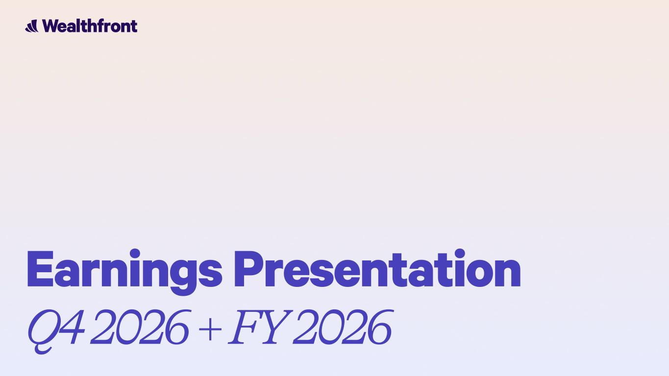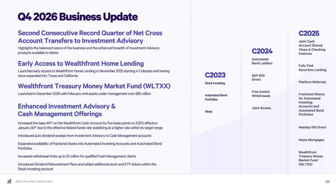 Note: Years reflect calendar years. Q4 2026 Business Update Early Access to Wealthfront Home Lending Wealthfront Treasury Money Market Fund (WLTXX) Second Consecutive Record Quarter of Net Cross Account Transfers to Investment Advisory Launched in December 2025 with February-end assets under management over $85 million Highlights the balanced nature of the business and the enhanced breadth of Investment Advisory products available to clients Enhanced Investment Advisory & Cash Management Offerings Introduced auto dividend sweeps from Investment Advisory to Cash Management accounts Launched early access to Wealthfront Home Lending in November 2025 starting in Colorado and having since expanded into Texas and California C2024 Automated Bond Ladders S&P 500 Direct Free Instant Withdrawals Joint Access C2023 Stock Investing Automated Bond Portfolios Wires C2025 Joint Cash Account Shared Views & Checking Features Fully Paid Securities Lending Platform Referrals Fractional Shares for Automated Investing Accounts and Automated Bond Portfolios Nasdaq-100 Direct Home Mortgages Wealthfront Treasury Money Market Fund (WLTXX) 03 Increased withdrawal limits up to $1 million for qualified Cash Management clients Introduced Dividend Reinvestment Plans and added additional stock and ETF tickers within the Stock Investing account Expanded availability of fractional shares into Automated Investing Accounts and Automated Bond Portfolios Increased the base APY on the Wealthfront Cash Account by five basis points to 3.30% effective January 30th due to the effective federal funds rate stabilizing at a higher rate within its target range