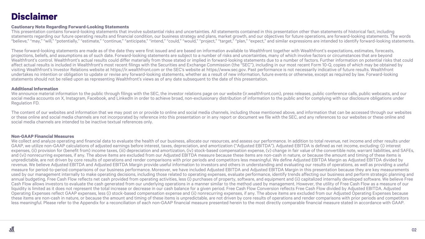 Disclaimer Cautionary Note Regarding Forward-Looking Statements This presentation contains forward-looking statements that involve substantial risks and uncertainties. All statements contained in this presentation other than statements of historical fact, including statements regarding our future operating results and financial condition, our business strategy and plans, market growth, and our objectives for future operations, are forward-looking statements. The words “believe,” “may,” “will,” “potentially,” “estimate,” “continue,” “anticipate,” “intend,” “could,” “would,” “project,” “target,” “plan,” “expect,” and similar expressions are intended to identify forward-looking statements. These forward-looking statements are made as of the date they were first issued and are based on information available to Wealthfront together with Wealthfront’s expectations, estimates, forecasts, projections, beliefs, and assumptions as of such date. Forward-looking statements are subject to a number of risks and uncertainties, many of which involve factors or circumstances that are beyond Wealthfront’s control. Wealthfront’s actual results could differ materially from those stated or implied in forward-looking statements due to a number of factors. Further information on potential risks that could affect actual results is included in Wealthfront’s most recent filings with the Securities and Exchange Commission (the “SEC”), including in our most recent Form 10-Q, copies of which may be obtained by visiting Wealthfront’s Investor Relations website at https://ir.wealthfront.com or the SEC's website at https://www.sec.gov. Past performance is not necessarily indicative of future results. Wealthfront undertakes no intention or obligation to update or revise any forward-looking statements, whether as a result of new information, future events or otherwise, except as required by law. Forward-looking statements should not be relied upon as representing Wealthfront’s views as of any date subsequent to the date of this presentation. Additional Information We announce material information to the public through filings with the SEC, the investor relations page on our website (ir.wealthfront.com), press releases, public conference calls, public webcasts, and our social media accounts on X, Instagram, Facebook, and LinkedIn in order to achieve broad, non-exclusionary distribution of information to the public and for complying with our disclosure obligations under Regulation FD. The content of our websites and information that we may post on or provide to online and social media channels, including those mentioned above, and information that can be accessed through our websites or these online and social media channels are not incorporated by reference into this presentation or in any report or document we file with the SEC, and any references to our websites or these online and social media channels are intended to be inactive textual references only. Non-GAAP Financial Measures We collect and analyze operating and financial data to evaluate the health of our business, allocate our resources, and assess our performance. In addition to total revenue, net income and other results under GAAP, we utilize non-GAAP calculations of adjusted earnings before interest, taxes, depreciation, and amortization (“Adjusted EBITDA”). Adjusted EBITDA is defined as net income, excluding: (i) interest expenses, (ii) provision for (benefit from) income taxes, (iii) depreciation and amortization, (iv) stock-based compensation expense, (v) change in fair value of the convertible note, warrant liabilities, and SAFEs, and (vi) nonrecurring expenses, if any. The above items are excluded from our Adjusted EBITDA measure because these items are non-cash in nature, or because the amount and timing of these items is unpredictable, are not driven by core results of operations and render comparisons with prior periods and competitors less meaningful. We define Adjusted EBITDA Margin as Adjusted EBITDA divided by revenue. We believe Adjusted EBITDA and Adjusted EBITDA Margin provide useful information to investors and others in understanding and evaluating our results of operations, as well as providing a useful measure for period-to-period comparisons of our business performance. Moreover, we have included Adjusted EBITDA and Adjusted EBITDA Margin in this presentation because they are key measurements used by our management internally to make operating decisions, including those related to operating expenses, evaluate performance, identify trends affecting our business and perform strategic planning and annual budgeting. Free Cash Flow reflects net cash provided from operating activities, less (i) purchases of property, software, and equipment and (ii) capitalized internally developed software. We believe Free Cash Flow allows investors to evaluate the cash generated from our underlying operations in a manner similar to the method used by management. However, the utility of Free Cash Flow as a measure of our liquidity is limited as it does not represent the total increase or decrease in our cash balance for a given period. Free Cash Flow Conversion reflects Free Cash Flow divided by Adjusted EBITDA. Adjusted Operating Expenses reflect GAAP expenses, less (i) stock-based compensation expense and (ii) nonrecurring expenses, if any. The above items are excluded from our Adjusted Operating Expenses because these items are non-cash in nature, or because the amount and timing of these items is unpredictable, are not driven by core results of operations and render comparisons with prior periods and competitors less meaningful. Please refer to the Appendix for a reconciliation of each non-GAAP financial measure presented herein to the most directly comparable financial measure stated in accordance with GAAP. 02