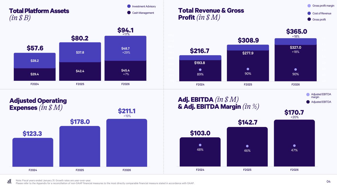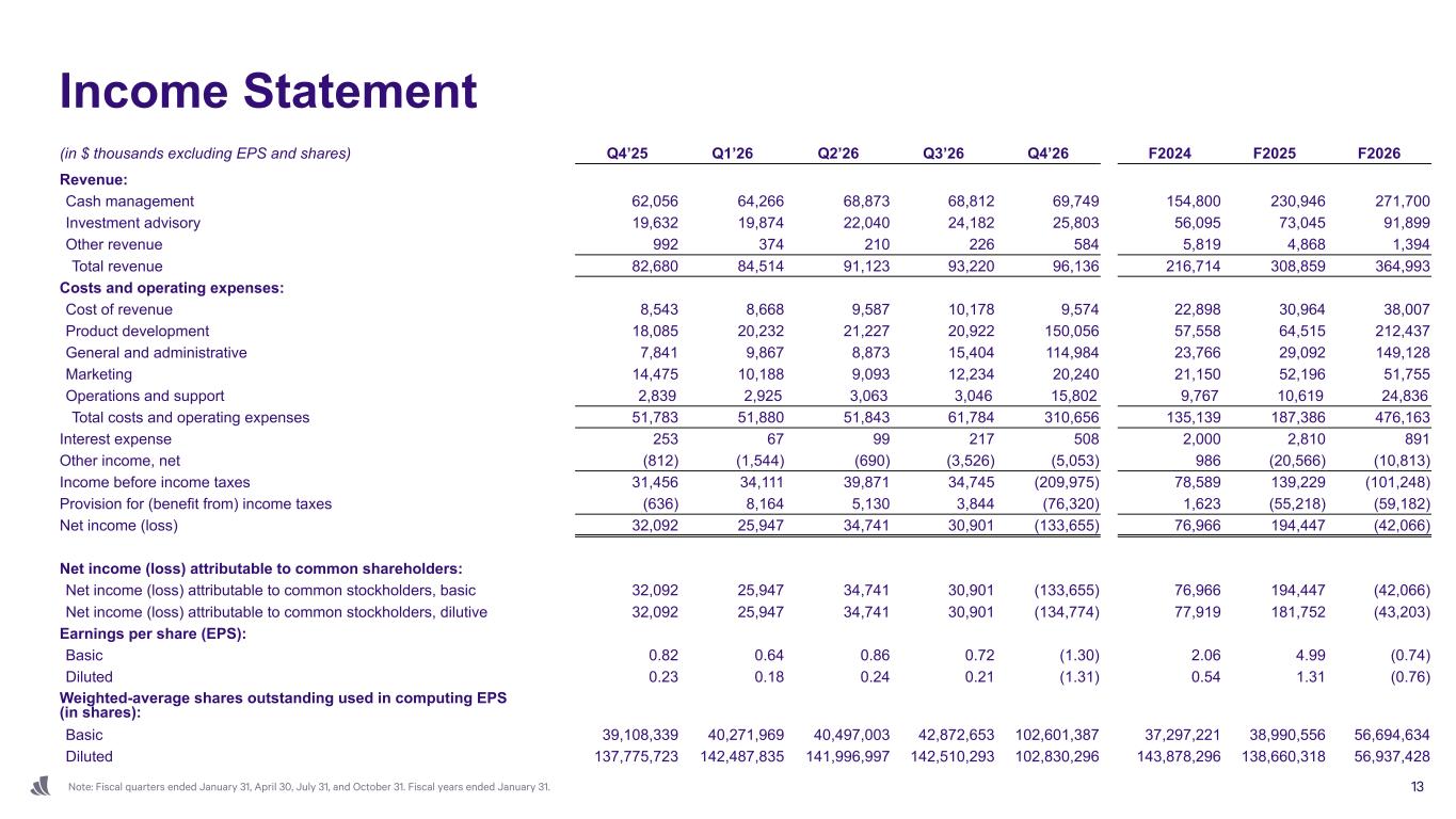 (in $ thousands excluding EPS and shares) Q4’25 Q1’26 Q2’26 Q3’26 Q4’26 F2024 F2025 F2026 Revenue: Cash management 62,056 64,266 68,873 68,812 69,749 154,800 230,946 271,700 Investment advisory 19,632 19,874 22,040 24,182 25,803 56,095 73,045 91,899 Other revenue 992 374 210 226 584 5,819 4,868 1,394 Total revenue 82,680 84,514 91,123 93,220 96,136 216,714 308,859 364,993 Costs and operating expenses: Cost of revenue 8,543 8,668 9,587 10,178 9,574 22,898 30,964 38,007 Product development 18,085 20,232 21,227 20,922 150,056 57,558 64,515 212,437 General and administrative 7,841 9,867 8,873 15,404 114,984 23,766 29,092 149,128 Marketing 14,475 10,188 9,093 12,234 20,240 21,150 52,196 51,755 Operations and support 2,839 2,925 3,063 3,046 15,802 9,767 10,619 24,836 Total costs and operating expenses 51,783 51,880 51,843 61,784 310,656 135,139 187,386 476,163 Interest expense 253 67 99 217 508 2,000 2,810 891 Other income, net (812) (1,544) (690) (3,526) (5,053) 986 (20,566) (10,813) Income before income taxes 31,456 34,111 39,871 34,745 (209,975) 78,589 139,229 (101,248) Provision for (benefit from) income taxes (636) 8,164 5,130 3,844 (76,320) 1,623 (55,218) (59,182) Net income (loss) 32,092 25,947 34,741 30,901 (133,655) 76,966 194,447 (42,066) Net income (loss) attributable to common shareholders: Net income (loss) attributable to common stockholders, basic 32,092 25,947 34,741 30,901 (133,655) 76,966 194,447 (42,066) Net income (loss) attributable to common stockholders, dilutive 32,092 25,947 34,741 30,901 (134,774) 77,919 181,752 (43,203) Earnings per share (EPS): Basic 0.82 0.64 0.86 0.72 (1.30) 2.06 4.99 (0.74) Diluted 0.23 0.18 0.24 0.21 (1.31) 0.54 1.31 (0.76) Weighted-average shares outstanding used in computing EPS (in shares): Basic 39,108,339 40,271,969 40,497,003 42,872,653 102,601,387 37,297,221 38,990,556 56,694,634 Diluted 137,775,723 142,487,835 141,996,997 142,510,293 102,830,296 143,878,296 138,660,318 56,937,428 Income Statement 13Note: Fiscal quarters ended January 31, April 30, July 31, and October 31. Fiscal years ended January 31.