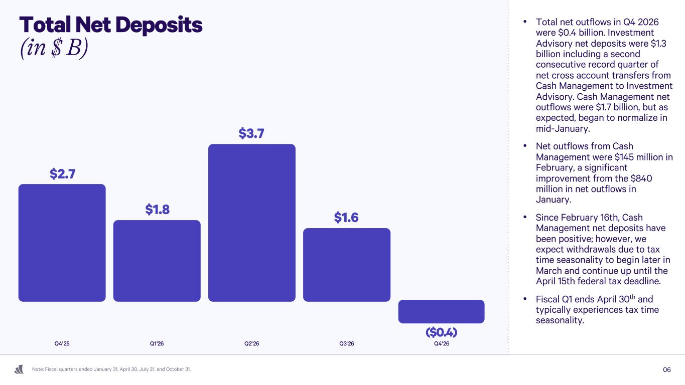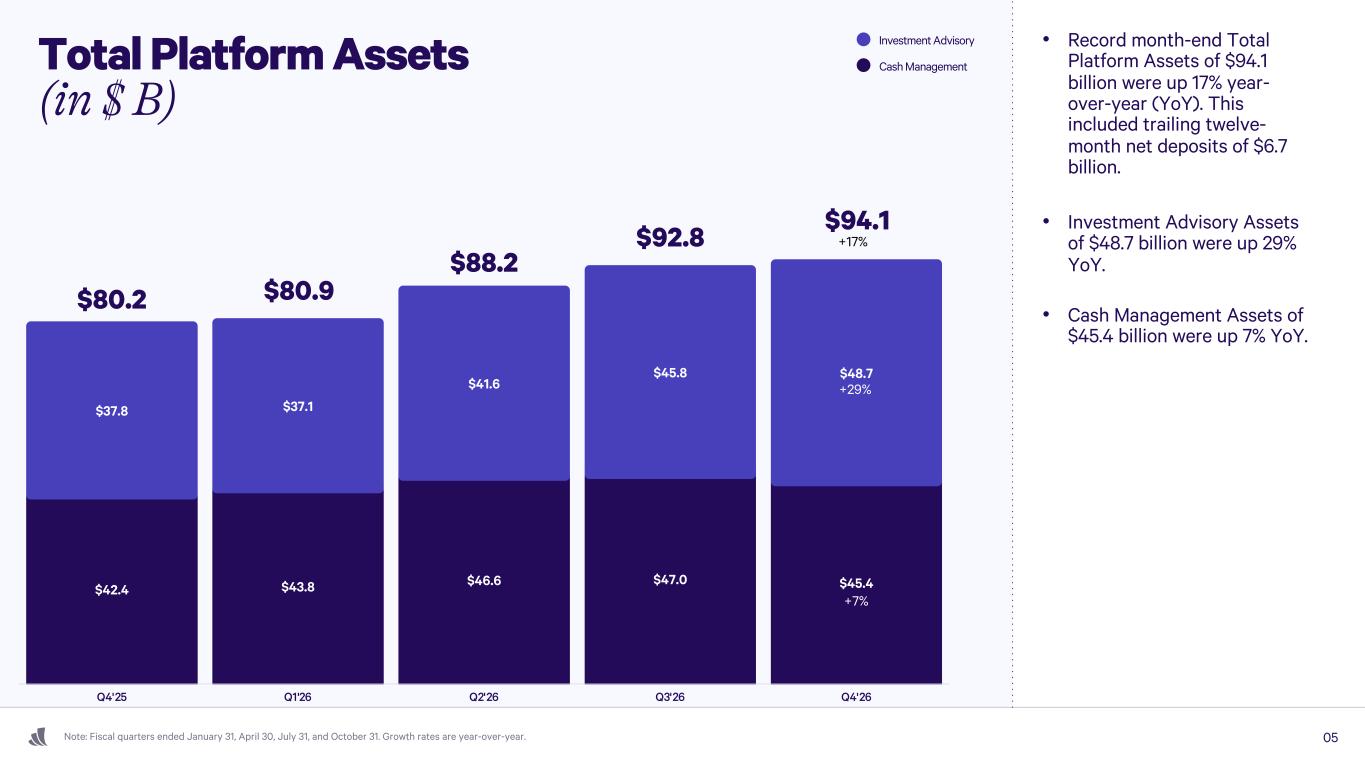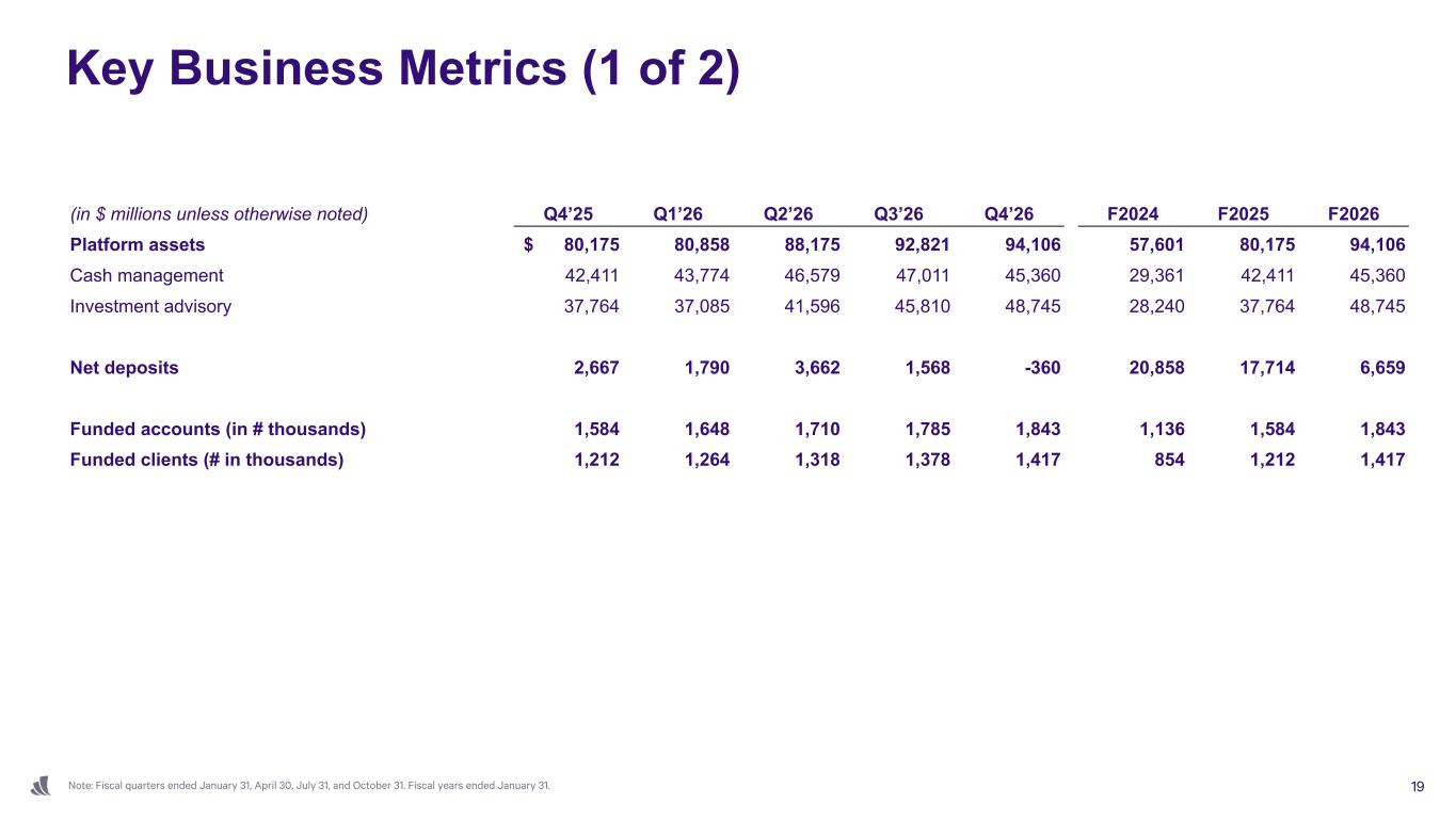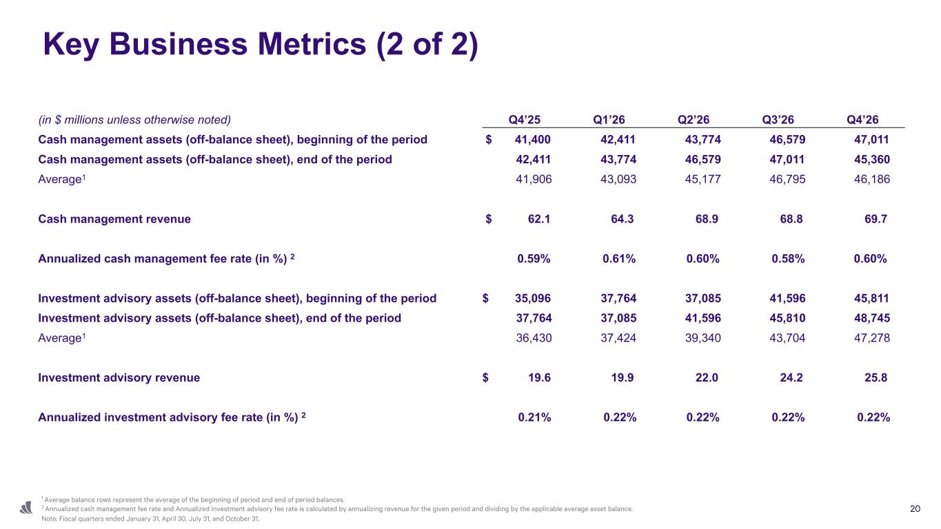 (in $ millions unless otherwise noted) Q4’25 Q1’26 Q2’26 Q3’26 Q4’26 F2024 F2025 F2026 Platform assets $ 80,175 80,858 88,175 92,821 94,106 57,601 80,175 94,106 Cash management 42,411 43,774 46,579 47,011 45,360 29,361 42,411 45,360 Investment advisory 37,764 37,085 41,596 45,810 48,745 28,240 37,764 48,745 Net deposits 2,667 1,790 3,662 1,568 -360 20,858 17,714 6,659 Funded accounts (in # thousands) 1,584 1,648 1,710 1,785 1,843 1,136 1,584 1,843 Funded clients (# in thousands) 1,212 1,264 1,318 1,378 1,417 854 1,212 1,417 Key Business Metrics (1 of 2) 19Note: Fiscal quarters ended January 31, April 30, July 31, and October 31. Fiscal years ended January 31.