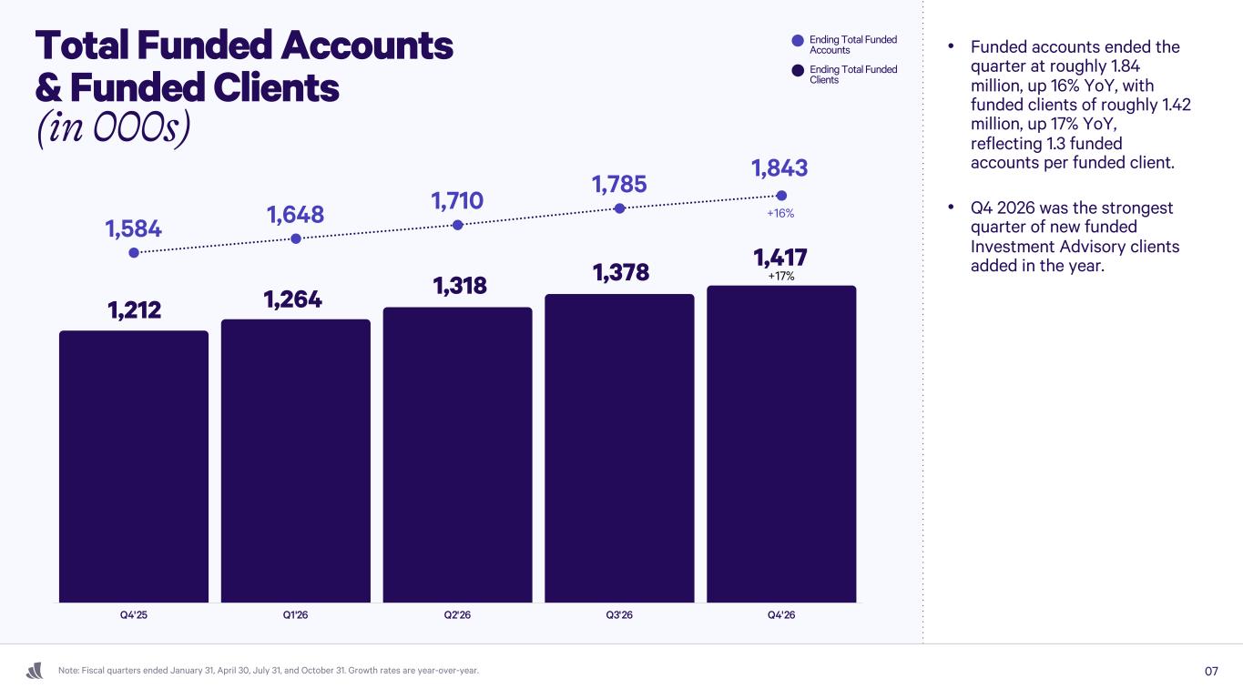 Total Funded Accounts & Funded Clients (in 000s) • Funded accounts ended the quarter at roughly 1.84 million, up 16% YoY, with funded clients of roughly 1.42 million, up 17% YoY, reflecting 1.3 funded accounts per funded client. • Q4 2026 was the strongest quarter of new funded Investment Advisory clients added in the year. Ending Total Funded Accounts Ending Total Funded Clients 07 1,212 1,264 1,318 1,378 1,417 1,584 1,648 1,710 1,785 1,843 Q4'25 Q1'26 Q2'26 Q3'26 Q4'26 +16% +17% Note: Fiscal quarters ended January 31, April 30, July 31, and October 31. Growth rates are year-over-year.