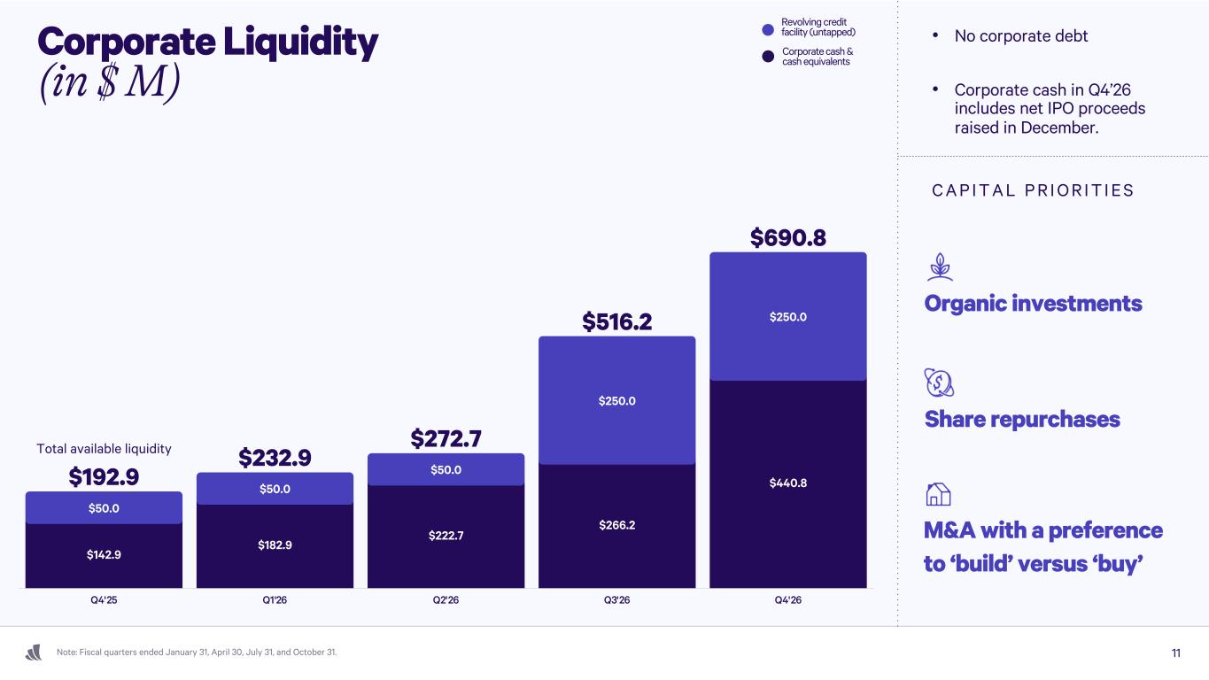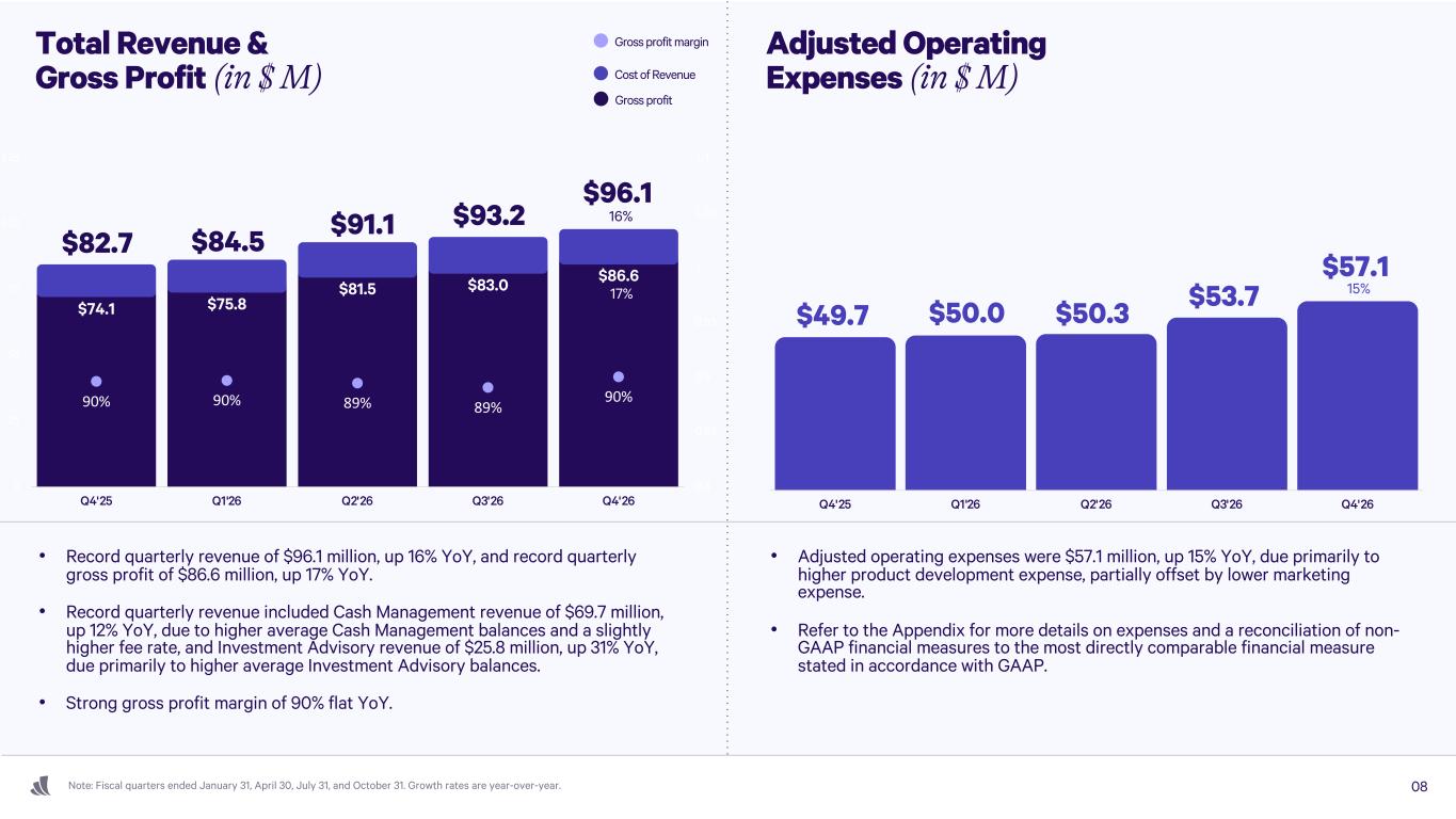 • Record quarterly revenue of $96.1 million, up 16% YoY, and record quarterly gross profit of $86.6 million, up 17% YoY. • Record quarterly revenue included Cash Management revenue of $69.7 million, up 12% YoY, due to higher average Cash Management balances and a slightly higher fee rate, and Investment Advisory revenue of $25.8 million, up 31% YoY, due primarily to higher average Investment Advisory balances. • Strong gross profit margin of 90% flat YoY. • Adjusted operating expenses were $57.1 million, up 15% YoY, due primarily to higher product development expense, partially offset by lower marketing expense. • Refer to the Appendix for more details on expenses and a reconciliation of non- GAAP financial measures to the most directly comparable financial measure stated in accordance with GAAP. Total Revenue & Gross Profit (in $ M) Adjusted Operating Expenses (in $ M)Cost of Revenue Gross profit margin Gross profit 08 $74.1 $75.8 $81.5 $83.0 $86.6 $82.7 $84.5 $91.1 $93.2 $96.1 90% 90% 89% 89% 90% 0.8 0.85 0.9 0.95 1 1.05 1.1 0 25 50 75 100 125 Q4'25 Q1'26 Q2'26 Q3'26 Q4'26 $49.7 $50.0 $50.3 $53.7 $57.1 Q4'25 Q1'26 Q2'26 Q3'26 Q4'26 15%17% 16% Note: Fiscal quarters ended January 31, April 30, July 31, and October 31. Growth rates are year-over-year.