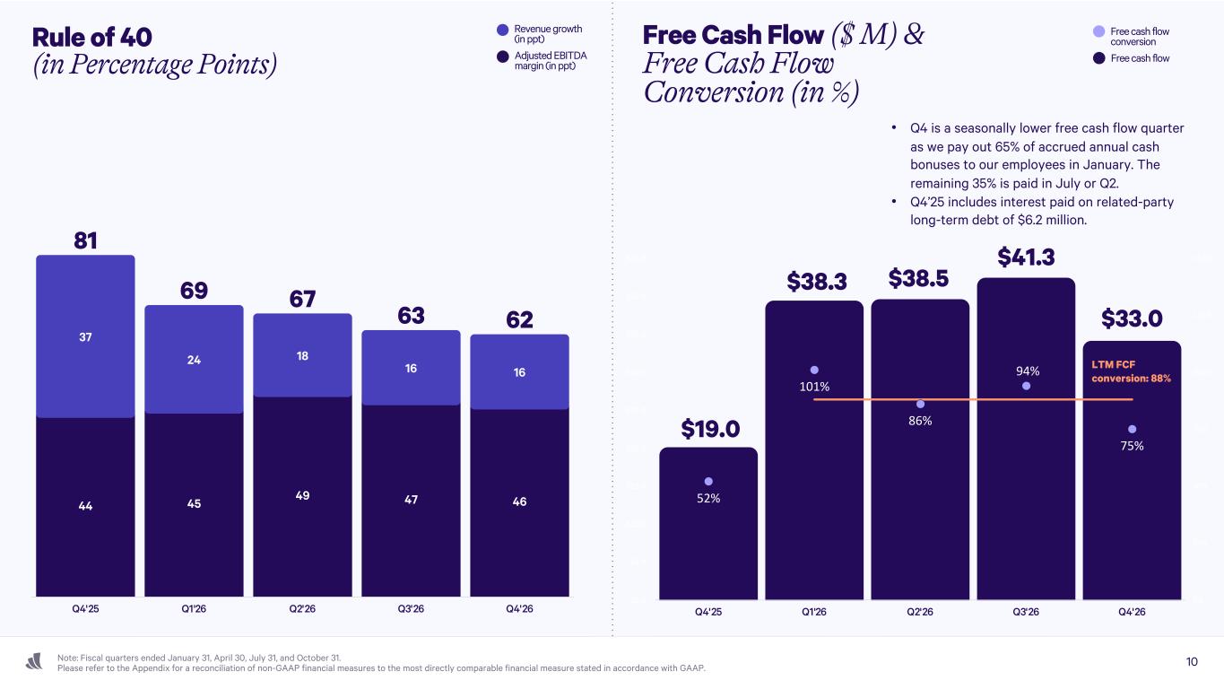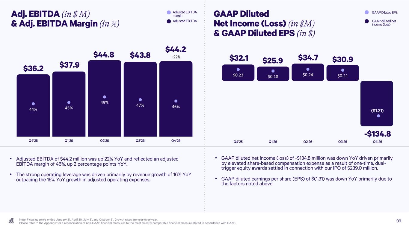 • Adjusted EBITDA of $44.2 million was up 22% YoY and reflected an adjusted EBITDA margin of 46%, up 2 percentage points YoY. • The strong operating leverage was driven primarily by revenue growth of 16% YoY outpacing the 15% YoY growth in adjusted operating expenses. • GAAP diluted net income (loss) of -$134.8 million was down YoY driven primarily by elevated share-based compensation expense as a result of one-time, dual- trigger equity awards settled in connection with our IPO of $239.0 million. • GAAP diluted earnings per share (EPS) of $(1.31) was down YoY primarily due to the factors noted above. Adjusted EBITDA margin Adjusted EBITDA GAAP Diluted EPS GAAP diluted net income (loss) Adj. EBITDA (in $ M) & Adj. EBITDA Margin (in %) GAAP Diluted Net Income (Loss) (in $M) & GAAP Diluted EPS (in $) 09 $32.1 $25.9 $34.7 $30.9 -$134.8 $0.23 $0.18 $0.24 $0.21 ($1.31) Q4'25 Q1'26 Q2'26 Q3'26 Q4'26 $36.2 $37.9 $44.8 $43.8 $44.2 44% 45% 49% 47% 46% Q4'25 Q1'26 Q2'26 Q3'26 Q4'26 +22% Note: Fiscal quarters ended January 31, April 30, July 31, and October 31. Growth rates are year-over-year. Please refer to the Appendix for a reconciliation of non-GAAP financial measures to the most directly comparable financial measure stated in accordance with GAAP. ($1.31)