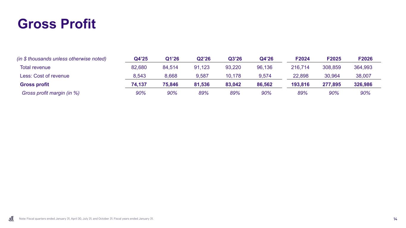 (in $ thousands unless otherwise noted) Q4’25 Q1’26 Q2’26 Q3’26 Q4’26 F2024 F2025 F2026 Total revenue 82,680 84,514 91,123 93,220 96,136 216,714 308,859 364,993 Less: Cost of revenue 8,543 8,668 9,587 10,178 9,574 22,898 30,964 38,007 Gross profit 74,137 75,846 81,536 83,042 86,562 193,816 277,895 326,986 Gross profit margin (in %) 90% 90% 89% 89% 90% 89% 90% 90% Gross Profit 14Note: Fiscal quarters ended January 31, April 30, July 31, and October 31. Fiscal years ended January 31.