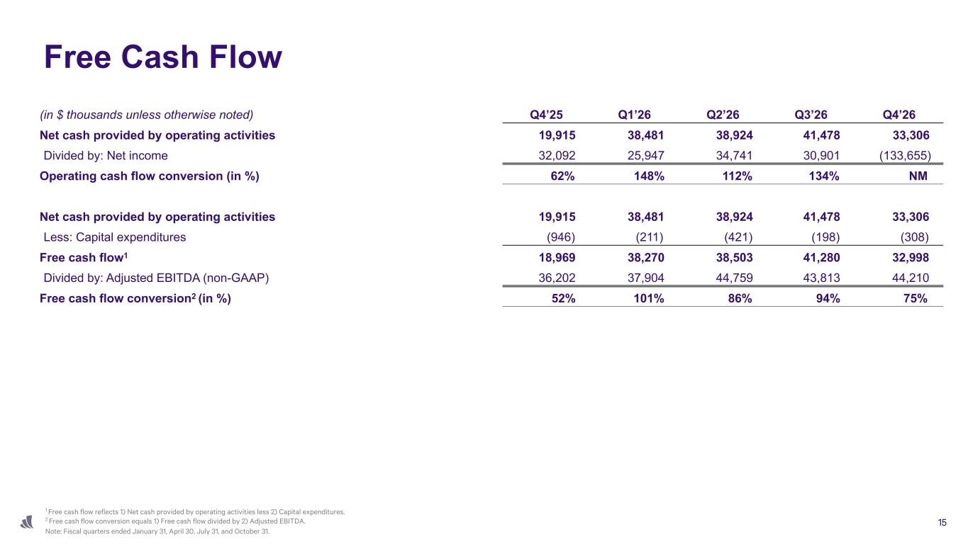 (in $ thousands unless otherwise noted) Q4’25 Q1’26 Q2’26 Q3’26 Q4’26 Net cash provided by operating activities 19,915 38,481 38,924 41,478 33,306 Divided by: Net income 32,092 25,947 34,741 30,901 (133,655) Operating cash flow conversion (in %) 62% 148% 112% 134% NM Net cash provided by operating activities 19,915 38,481 38,924 41,478 33,306 Less: Capital expenditures (946) (211) (421) (198) (308) Free cash flow1 18,969 38,270 38,503 41,280 32,998 Divided by: Adjusted EBITDA (non-GAAP) 36,202 37,904 44,759 43,813 44,210 Free cash flow conversion2 (in %) 52% 101% 86% 94% 75% Free Cash Flow 1 Free cash flow reflects 1) Net cash provided by operating activities less 2) Capital expenditures. 2 Free cash flow conversion equals 1) Free cash flow divided by 2) Adjusted EBITDA. Note: Fiscal quarters ended January 31, April 30, July 31, and October 31. 15