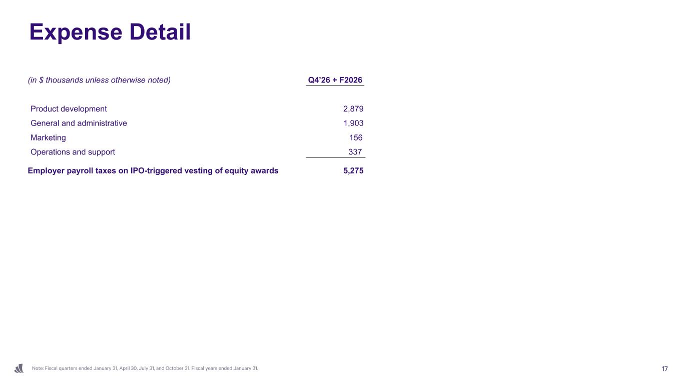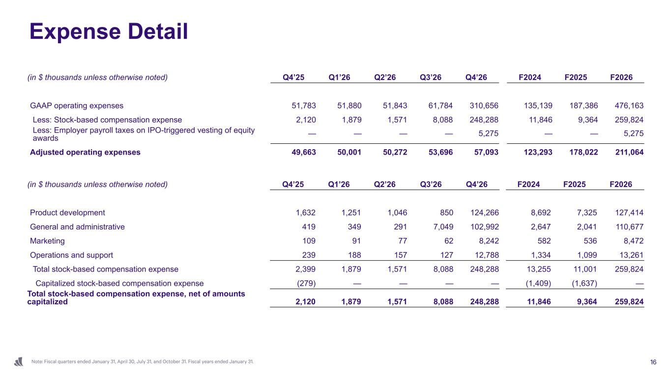 (in $ thousands unless otherwise noted) Q4’25 Q1’26 Q2’26 Q3’26 Q4’26 F2024 F2025 F2026 Product development 1,632 1,251 1,046 850 124,266 8,692 7,325 127,414 General and administrative 419 349 291 7,049 102,992 2,647 2,041 110,677 Marketing 109 91 77 62 8,242 582 536 8,472 Operations and support 239 188 157 127 12,788 1,334 1,099 13,261 Total stock-based compensation expense 2,399 1,879 1,571 8,088 248,288 13,255 11,001 259,824 Capitalized stock-based compensation expense (279) — — — — (1,409) (1,637) — Total stock-based compensation expense, net of amounts capitalized 2,120 1,879 1,571 8,088 248,288 11,846 9,364 259,824 Expense Detail (in $ thousands unless otherwise noted) Q4’25 Q1’26 Q2’26 Q3’26 Q4’26 F2024 F2025 F2026 GAAP operating expenses 51,783 51,880 51,843 61,784 310,656 135,139 187,386 476,163 Less: Stock-based compensation expense 2,120 1,879 1,571 8,088 248,288 11,846 9,364 259,824 Less: Employer payroll taxes on IPO-triggered vesting of equity awards — — — — 5,275 — — 5,275 Adjusted operating expenses 49,663 50,001 50,272 53,696 57,093 123,293 178,022 211,064 16Note: Fiscal quarters ended January 31, April 30, July 31, and October 31. Fiscal years ended January 31.