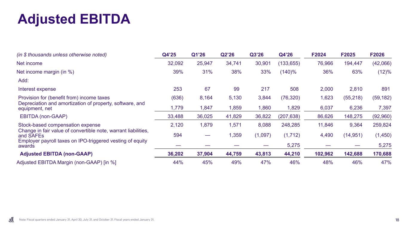 (in $ thousands unless otherwise noted) Q4’25 Q1’26 Q2’26 Q3’26 Q4’26 F2024 F2025 F2026 Net income 32,092 25,947 34,741 30,901 (133,655) 76,966 194,447 (42,066) Net income margin (in %) 39% 31% 38% 33% (140)% 36% 63% (12)% Add: Interest expense 253 67 99 217 508 2,000 2,810 891 Provision for (benefit from) income taxes (636) 8,164 5,130 3,844 (76,320) 1,623 (55,218) (59,182) Depreciation and amortization of property, software, and equipment, net 1,779 1,847 1,859 1,860 1,829 6,037 6,236 7,397 EBITDA (non-GAAP) 33,488 36,025 41,829 36,822 (207,638) 86,626 148,275 (92,960) Stock-based compensation expense 2,120 1,879 1,571 8,088 248,285 11,846 9,364 259,824 Change in fair value of convertible note, warrant liabilities, and SAFEs 594 — 1,359 (1,097) (1,712) 4,490 (14,951) (1,450) Employer payroll taxes on IPO-triggered vesting of equity awards — — — — 5,275 — — 5,275 Adjusted EBITDA (non-GAAP) 36,202 37,904 44,759 43,813 44,210 102,962 142,688 170,688 Adjusted EBITDA Margin (non-GAAP) [in %] 44% 45% 49% 47% 46% 48% 46% 47% Adjusted EBITDA 18Note: Fiscal quarters ended January 31, April 30, July 31, and October 31. Fiscal years ended January 31.