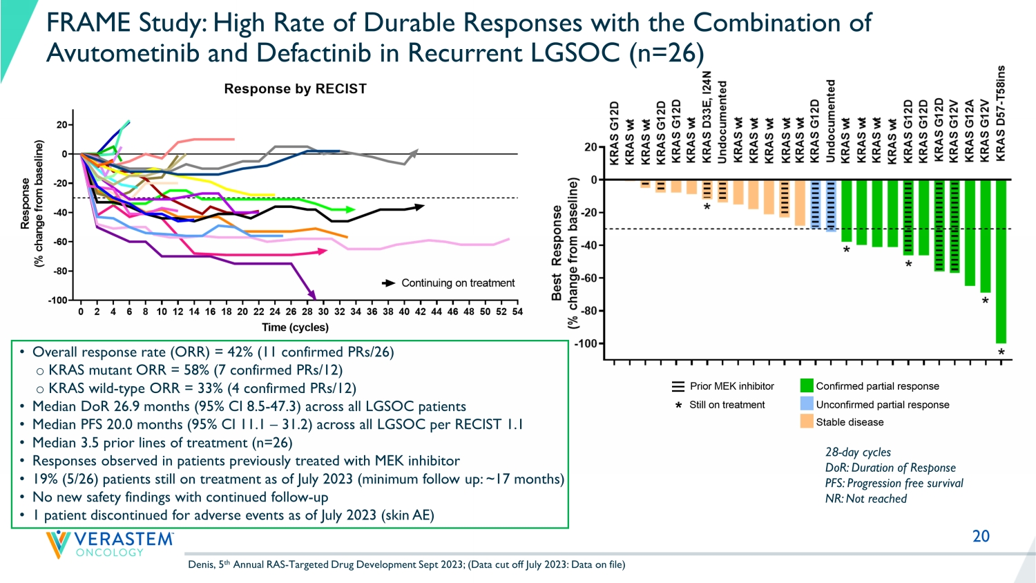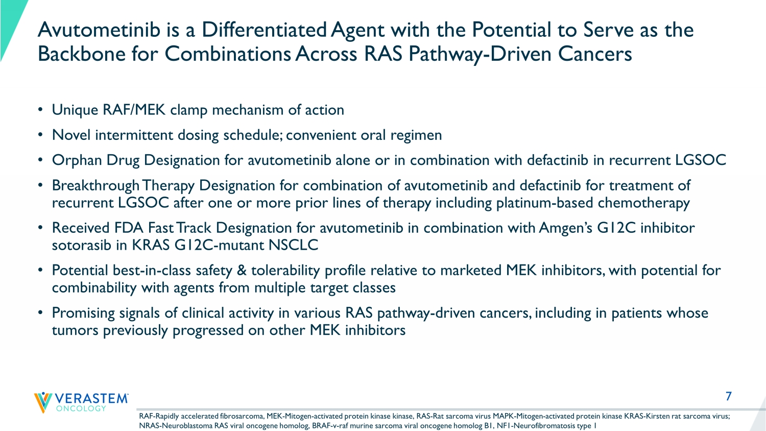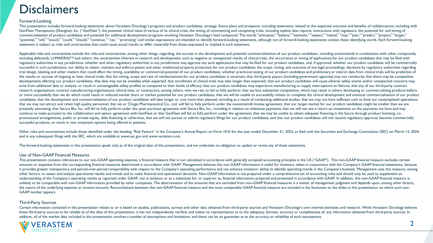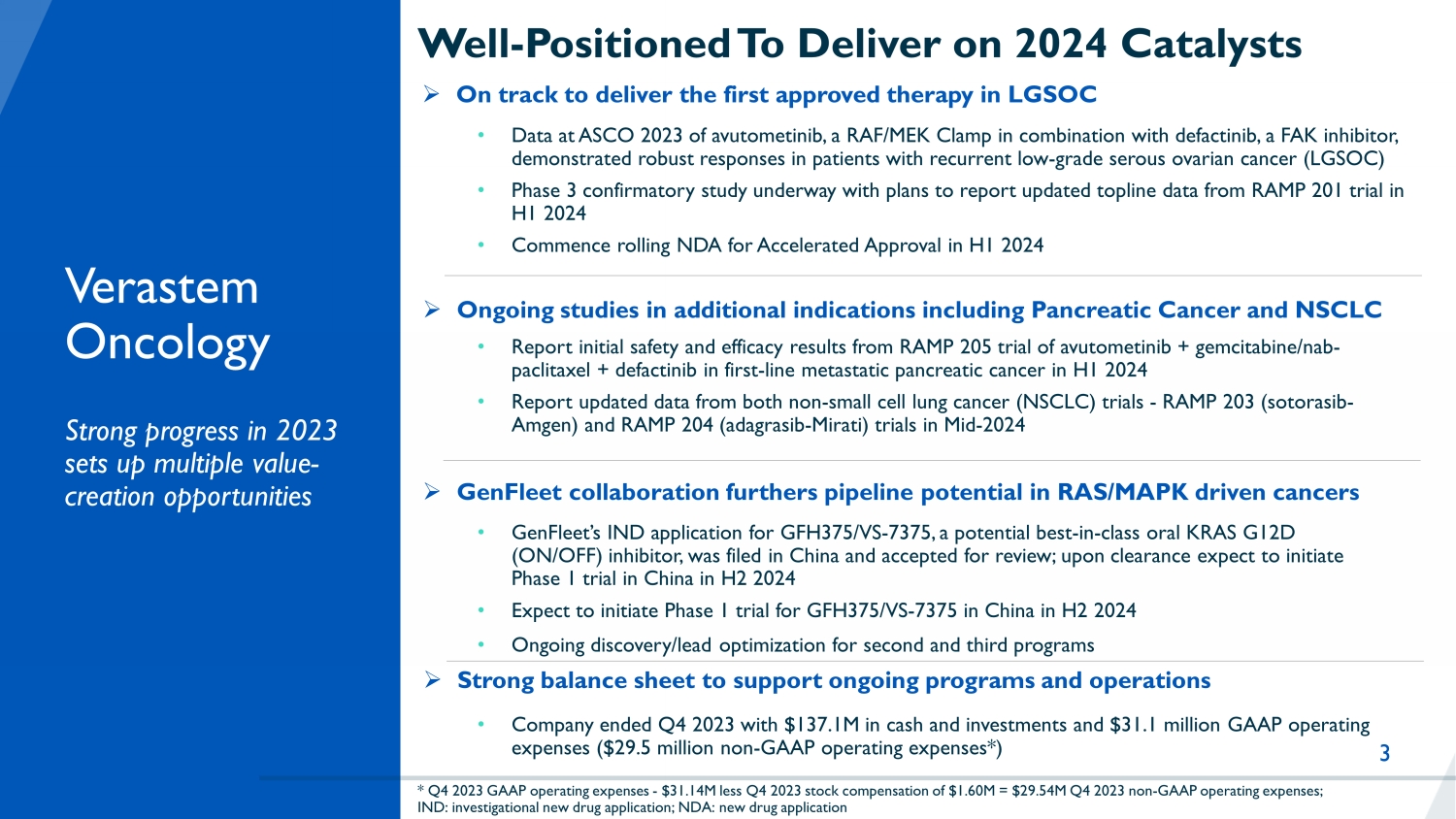 2 Disclaimers Forward - Looking This presentation includes forward - looking statements about Verastem Oncology’s programs and product candidates, strategy, futur e plans and prospects, including statements related to the expected outcome and benefits of collaborations, including with GenFleet Therapeutics (Shanghai), Inc. (“GenFleet”), the potential clinical value of various of its clinical trials, the timi ng of commencing and completing trials, including topline data reports, interactions with regulators, the potential for and timi ng of commercialization of product candidates and potential for additional development programs involving Verastem Oncology’s lead com pound. The words "anticipate," "believe," "estimate," "expect," "intend," "may," "plan," "predict," "project," "target," "potential," "will," "would," "could," "should," "continue," “can,” “promising” and similar expressions are intended to ident ify forward - looking statements, although not all forward - looking statements contain these identifying words. Each forward - looking statement is subject to risks and uncertainties that could cause actual results to differ materially from those expressed or imp lied in such statement. Applicable risks and uncertainties include the risks and uncertainties, among other things, regarding: the success in the dev elo pment and potential commercialization of our product candidates, including avutometinib in combination with other compounds, including defactinib, LUMAKRAS Œ and others; the uncertainties inherent in research and development, such as negative or unexpected results of clinical trials , the occurrence or timing of applications for our product candidates that may be filed with regulatory authorities in any jurisdictions; whether and when regulatory authorities in any jurisdictions may approve any suc h a pplications that may be filed for our product candidates, and, if approved, whether our product candidates will be commercial ly successful in such jurisdictions; our ability to obtain, maintain and enforce patent and other intellectual property protecti on for our product candidates; the scope, timing, and outcome of any legal proceedings; decisions by regulatory authorities rega rdi ng trial design, labeling and other matters that could affect the timing, availability or commercial potential of our product ca ndi dates; whether preclinical testing of our product candidates and preliminary or interim data from clinical trials will be pre dic tive of the results or success of ongoing or later clinical trials; that the timing, scope and rate of reimbursement for our product can didates is uncertain; that third - party payors (including government agencies) may not reimburse; that there may be competitive developments affecting our product candidates; that data may not be available when expected; that enrollment of clinical tria ls may take longer than expected; that our product candidates will cause adverse safety events and/or unexpected concerns may arise from additional data or analysis, or result in unmanageable safety profiles as compared to their levels of efficacy; th at our product candidates may experience manufacturing or supply interruptions or failures; that any of our third - party contract research organizations, contract manufacturing organizations, clinical sites, or contractors, among others, who we rely on fa il to fully perform; that we face substantial competition, which may result in others developing or commercializing products bef ore or more successfully than we do which could result in reduced market share or market potential for our product candidates; th at we will be unable to successfully initiate or complete the clinical development and eventual commercialization of our product candidates; that the development and commercialization of our product candidates will take longer or cost more than planned, inc luding as a result of conducting additional studies; that we may not have sufficient cash to fund our contemplated operations ; that we may not attract and retain high quality personnel; that we or Chugai Pharmaceutical Co., Ltd. will fail to fully perf orm under the avutometinib license agreement; that our target market for our product candidates might be smaller than we are presently estimating; that Secura Bio, Inc. will fail to fully perform under the asset purchase agreement with Secura Bio, Inc., including in relation to milestone payments; that we will not see a return on investment on the payments we have a nd may continue to make pursuant to the collaboration and option agreement with GenFleet or that GenFleet will fail to fully perform un der the agreement; that we may be unable to obtain adequate financing in the future through product licensing, co - promotional arrangements, public or private equity, debt financing or otherwise; that we will not pursue or submit regulatory fi lings for our product candidates; and that our product candidates will not receive regulatory approval, become commercially successful products, or result in new treatment options being offered to patients. Other risks and uncertainties include those identified under the heading “Risk Factors” in the Company’s Annual Report on For m 1 0 - K for the year ended December 31, 2023, as filed with the Securities and Exchange Commission (SEC) on March 14, 2024, and in any subsequent filings with the SEC, which are available at www.sec.gov and www.verastem.com. The forward - looking statements in this presentation speak only as of the original date of this presentation, and we undertake no obligation to update or revise any of these statements. Use of Non - GAAP Financial Measures This presentation contains references to our non - GAAP operating expense, a financial measure that is not calculated in accordanc e with generally accepted accounting principles in the US (“GAAP”). This non - GAAP financial measure excludes certain amounts or expens