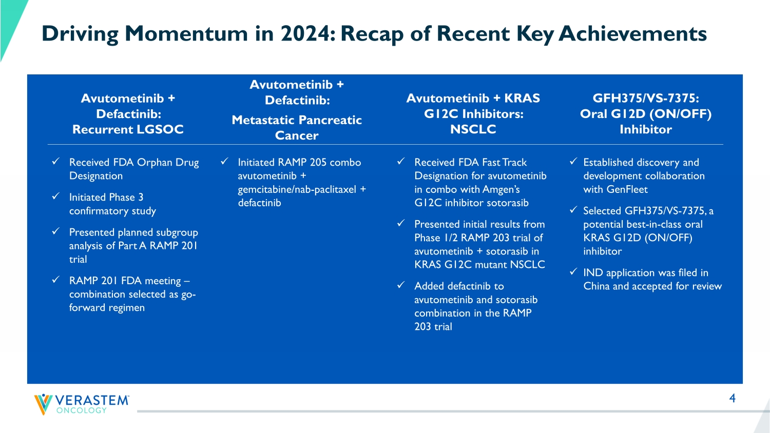 3 Verastem Oncology Strong progress in 2023 sets up multiple value - creation opportunities » On track to deliver the first approved therapy in LGSOC • Data at ASCO 2023 of avutometinib, a RAF/MEK Clamp in combination with defactinib, a FAK inhibitor, demonstrated robust responses in patients with recurrent low - grade serous ovarian cancer (LGSOC) • P hase 3 confirmatory study underway with plans to report updated topline data from RAMP 201 trial in H1 2024 • Commence rolling NDA for Accelerated Approval in H1 2024 » Ongoing studies in additional indications including Pancreatic Cancer and NSCLC • Report initial safety and efficacy results from RAMP 205 trial of avutometinib + gemcitabine/nab - paclitaxel + defactinib in first - line metastatic pancreatic cancer in H1 2024 • Report updated data from both non - small cell lung cancer (NSCLC) trials - RAMP 203 ( sotorasib - Amgen) and RAMP 204 ( adagrasib - Mirati ) trials in Mid - 2024 » GenFleet collaboration furthers pipeline potential in RAS/MAPK driven cancers • GenFleet expected to submit IND for GFH375/VS - 7375, a potential best - in - class oral KRAS G12D (ON/OFF) inhibitor in China in H1 2024 • Expect to initiate Phase 1 trial for GFH375/VS - 7375 in China in H2 2024 • Ongoing discovery/lead optimization for second and third programs » Strong balance sheet to support ongoing programs and operations • Company ended Q4 2023 with $137.1M in cash and investments and $31.1 million GAAP operating expenses ($29.5 million non - GAAP operating expenses*) Well - Positioned To Deliver on 2024 Catalysts * Q4 2023 GAAP operating expenses - $31.14M less Q4 2023 stock compensation of $1.60M = $29.54M Q4 2023 non - GAAP operating expen ses; IND: investigational new drug application; NDA: new drug application