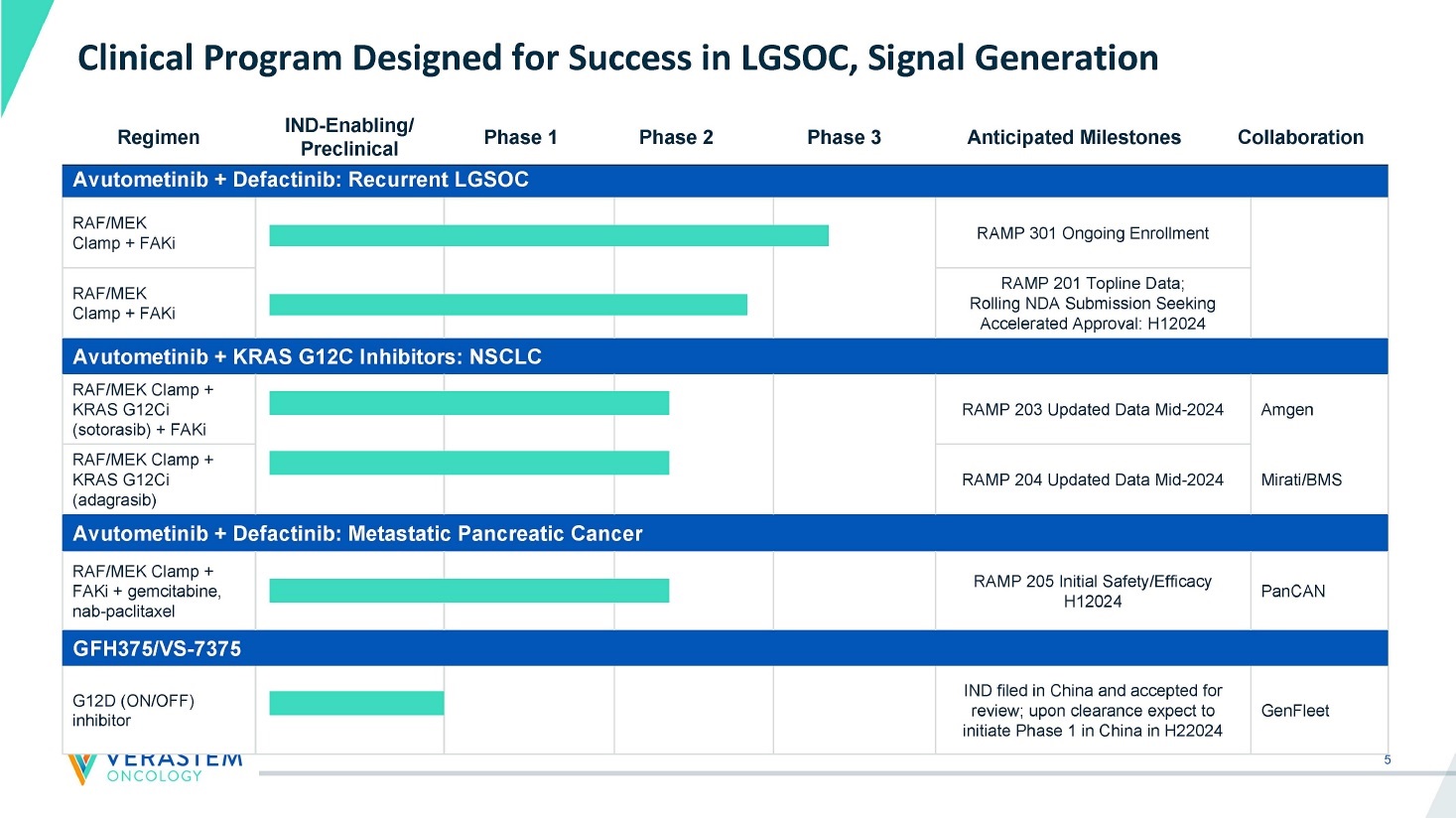 4 Avutometinib + Defactinib: Recurrent LGSOC Avutometinib + Defactinib: Metastatic Pancreatic Cancer Avutometinib + KRAS G12C Inhibitors: NSCLC GFH375/VS - 7375: Oral G12D (ON/OFF) Inhibitor Driving Momentum in 2024: Recap of Recent Key Achievements x Received FDA Orphan Drug Designation x Initiated Phase 3 confirmatory study x Presented planned subgroup analysis of Part A RAMP 201 trial x RAMP 201 FDA meeting – combination selected as go - forward regimen x Received FDA Fast Track Designation for avutometinib in combo with Amgen’s G12C inhibitor sotorasib x Presented initial results from Phase 1/2 RAMP 203 trial of avutometinib + sotorasib in KRAS G12C mutant NSCLC x Added defactinib to avutometinib and sotorasib combination in the RAMP 203 trial x Initiated RAMP 205 combo avutometinib + gemcitabine/nab - paclitaxel + defactinib x Established discovery and development collaboration with GenFleet x Selected GFH375/VS - 7375, a potential best - in - class oral KRAS G12D (ON/OFF) inhibitor