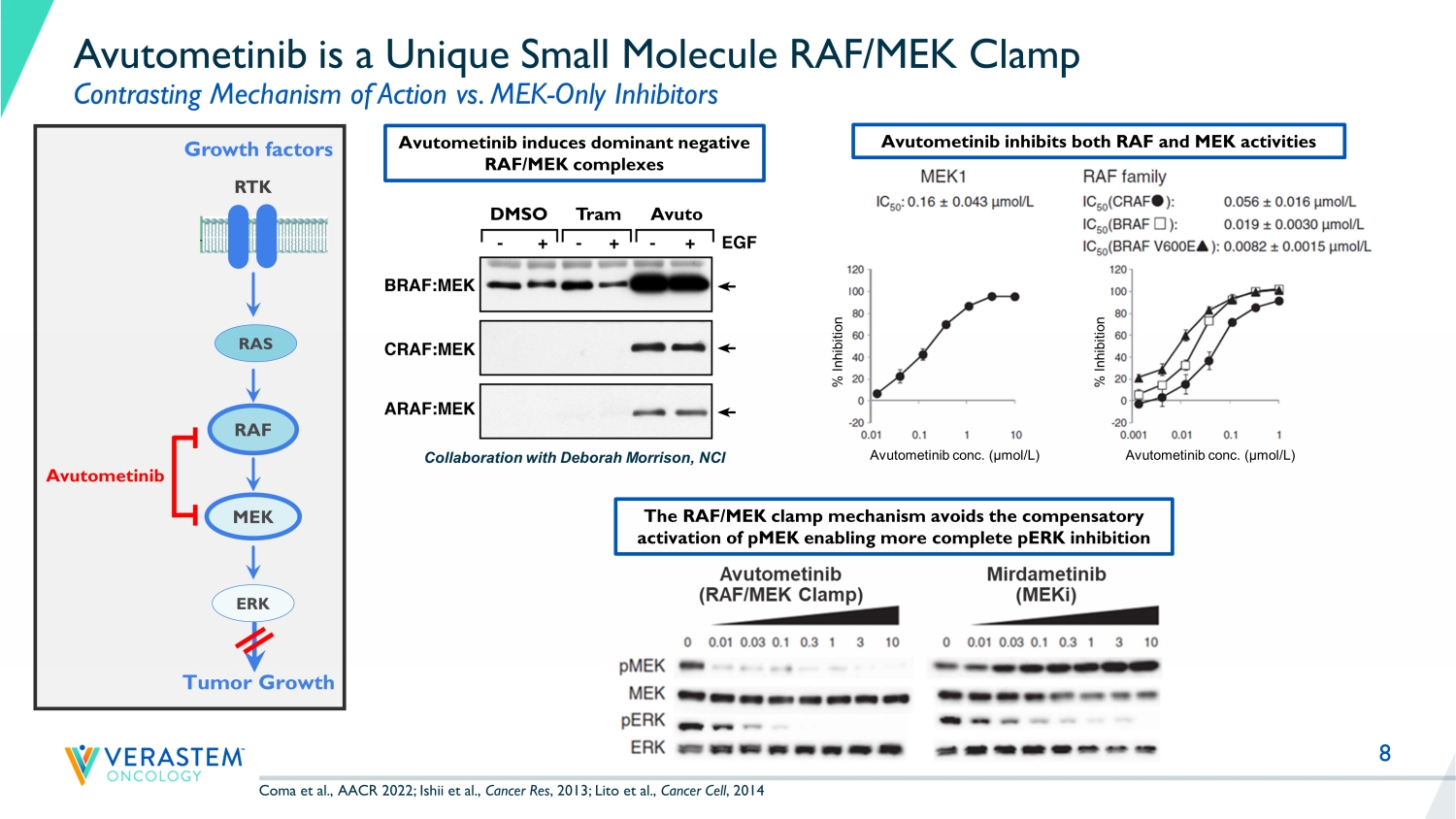 7 Avutometinib is a Differentiated Agent with the Potential to Serve as the Backbone for Combinations Across RAS Pathway - Driven Cancers • Unique RAF/MEK clamp mechanism of action • Novel intermittent dosing schedule; convenient oral regimen • Orphan Drug Designation for avutometinib alone or in combination with defactinib in recurrent LGSOC • Breakthrough Therapy Designation for combination of avutometinib and defactinib for treatment of recurrent LGSOC after one or more prior lines of therapy including platinum - based chemotherapy • Received FDA Fast Track Designation for avutometinib in combination with Amgen’s G12C inhibitor sotorasib in KRAS G12C - mutant NSCLC • Potential best - in - class safety & tolerability profile relative to marketed MEK inhibitors, with potential for combinability with agents from multiple target classes • Promising signals of clinical activity in various RAS pathway - driven cancers, including in patients whose tumors previously progressed on other MEK inhibitors RAF - Rapidly accelerated fibrosarcoma, MEK - Mitogen - activated protein kinase kinase , RAS - Rat sarcoma virus MAPK - Mitogen - activated protein kinase KRAS - Kirsten rat sarcoma virus; NRAS - Neuroblastoma RAS viral oncogene homolog, BRAF - v - raf murine sarcoma viral oncogene homolog B1, NF1 - Neurofibromatosis type 1