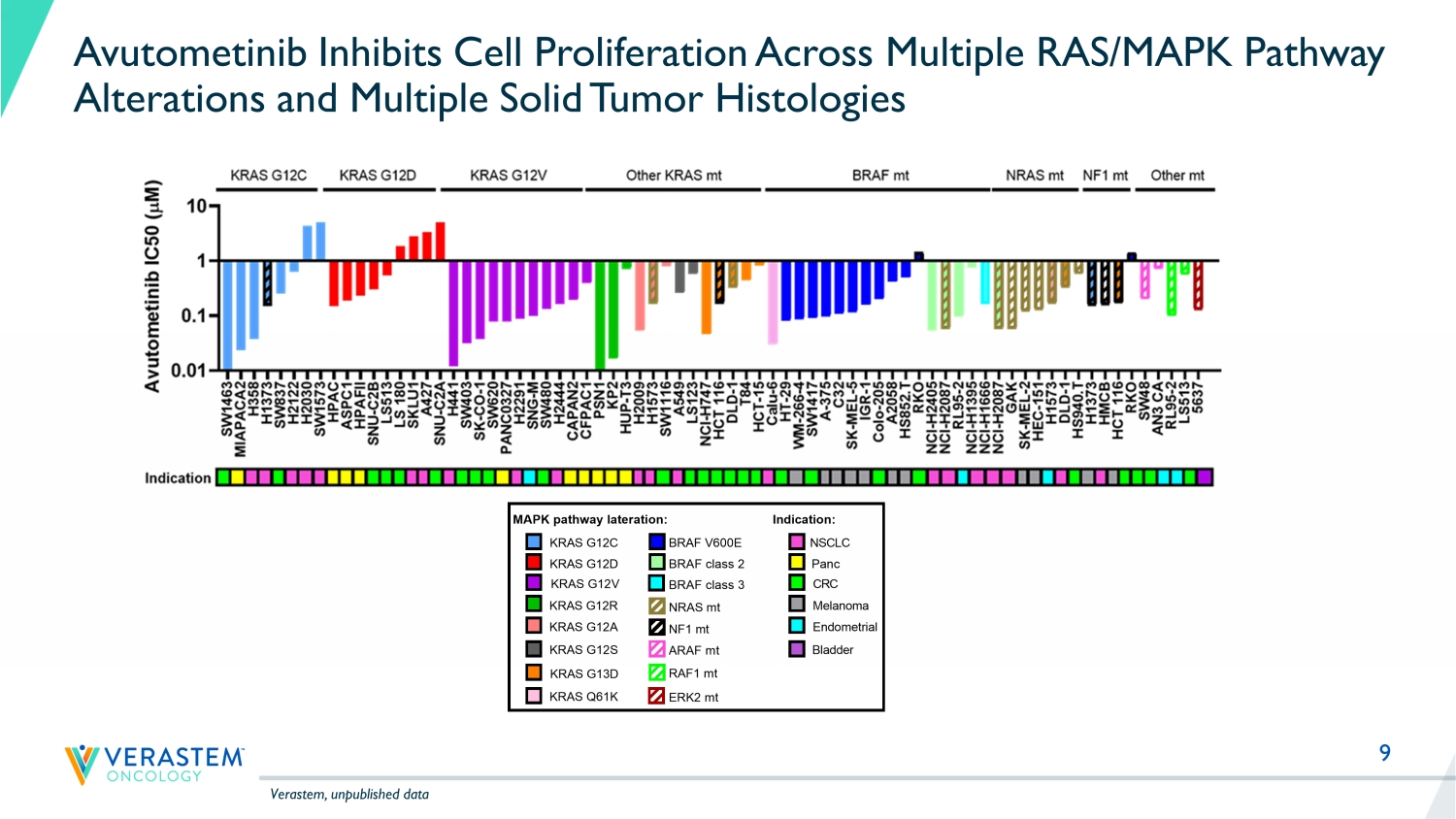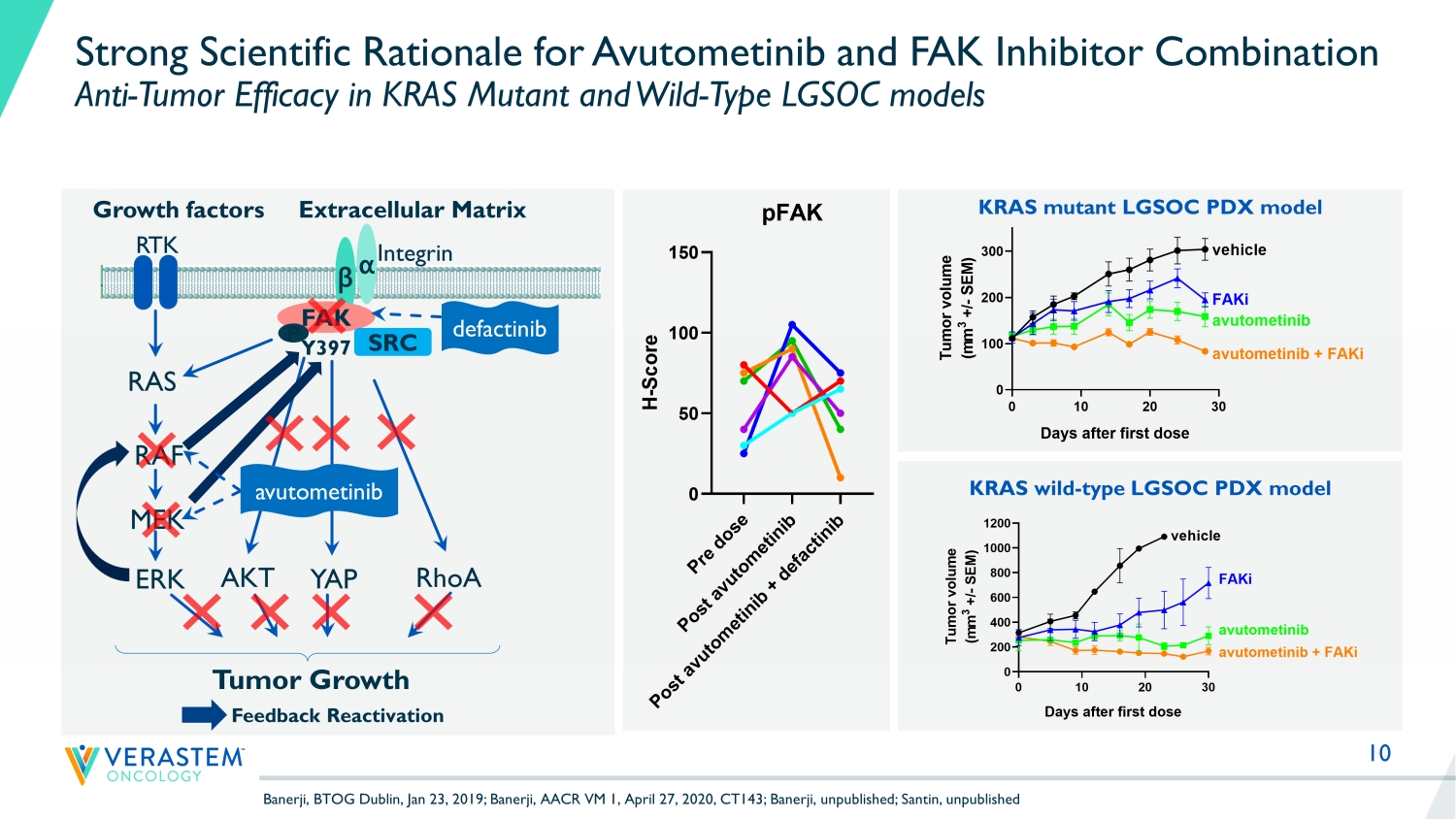 9 Avutometinib Inhibits Cell Proliferation Across Multiple RAS/MAPK Pathway Alterations and Multiple Solid Tumor Histologies Verastem, unpublished data S W 1 4 6 3 M I A P A C A 2 H 3 5 8 H 1 3 7 3 S W 8 3 7 H 2 1 2 2 H 2 0 3 0 S W 1 5 7 3 H P A C A S P C 1 H P A F I I S N U - C 2 B L S 5 1 3 L S 1 8 0 S K L U 1 A 4 2 7 S N U - C 2 A H 4 4 1 S W 4 0 3 S K - C O - 1 S W 6 2 0 P A N C 0 3 2 7 H 2 2 9 1 S N G - M S W 4 8 0 H 2 4 4 4 C A P A N 2 C F P A C 1 P S N 1 K P 2 H U P - T 3 H 2 0 0 9 H 1 5 7 3 S W 1 1 1 6 A 5 4 9 L S 1 2 3 N C I - H 7 4 7 H C T 1 1 6 D L D - 1 T 8 4 H C T - 1 5 C a l u - 6 H T - 2 9 W M - 2 6 6 - 4 S W 1 4 1 7 A - 3 7 5 C 3 2 S K - M E L - 5 I G R - 1 C o l o - 2 0 5 A 2 0 5 8 H S 8 5 2 . T R K O N C I - H 2 4 0 5 N C I - H 2 0 8 7 R L 9 5 - 2 N C I - H 1 3 9 5 N C I - H 1 7 5 5 N C I - H 1 6 6 6 N C I - H 2 0 8 7 G A K S K - M E L - 2 H E C - 1 5 1 H 1 5 7 3 D L D - 1 H S 9 4 0 . T H 1 3 7 3 H M C B H C T 1 1 6 R K O S W 4 8 A N 3 C A R L 9 5 - 2 L S 5 1 3 5 6 3 7 0.01 0.1 1 10 Avutometinib IC50 (3D proliferation assay) A v u t o m e t i n i b I C 5 0 ( M ) KRAS G12V KRAS G12D BRAF V600EKRAS G12C Indication NSCLC Panc CRC Indication:MAPK pathway lateration: Melanoma NF1 mt NRAS mt KRAS G12R BRAF class 2 KRAS G12C KRAS G12D KRAS G12V Other KRAS mt BRAF mt NRAS mt ARAF mt RAF1 mt Endometrial Bladder NF1 mt KRAS G12S KRAS G13D KRAS Q61K KRAS G12A ERK2 mt Other mt BRAF class 3