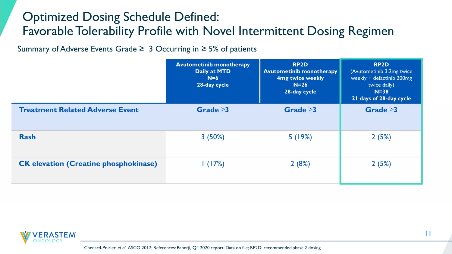 10 Strong Scientific Rationale for Avutometinib and FAK Inhibitor Combination Anti - Tumor Efficacy in KRAS Mutant and Wild - Type LGSOC models KRAS mutant LGSOC PDX model RTK RAS RAF MEK ERK YAP Growth factors β α Y397 Integrin FAK Extracellular Matrix SRC RhoA Tumor Growth P AKT avutometinib defactinib Feedback Reactivation 0 10 20 30 0 100 200 300 Tumor growth Days after first dose T u m o r v o l u m e ( m m 3 + / - S E M ) vehicle FAKi avutometinib avutometinib + FAKi KRAS wild - type LGSOC PDX model P r e d o s e P o s t a v u t o m e t i n i b P o s t a v u t o m e t i n i b + d e f a c t i n i b 0 50 100 150 pFAK H - S c o r e Banerji, BTOG Dublin, Jan 23, 2019; Banerji, AACR VM 1, April 27, 2020, CT143; Banerji, unpublished; Santin, unpublished