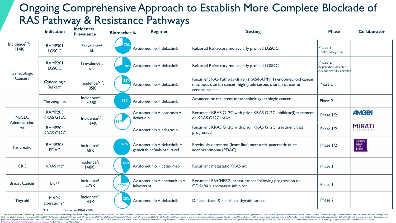 13 Indication Incidence/ Prevalence Regimen Setting Phase Collaborator RAMP301 LGSOC Avutometinib + defactinib Relapsed Refractory molecularly profiled LGSOC Gynecologic Cancers RAMP201 LGSOC Avutometinib + defactinib Relapsed Refractory molecularly profiled LGSOC Gynecologic Basket* Avutometinib + defactinib Recurrent RAS Pathway - driven (RAS/RAF/NF1) endometrioid cancer, mucinous ovarian cancer, high - grade serous ovarian cancer or cervical cancer Mesonephric Avutometinib + defactinib Advanced or recurrent mesonephric gynecologic cancer NSCLC Adenocarcino ma RAMP203 KRAS G12C RAMP204 KRAS G12C Avutometinib + sotorasib ± defactinib Recurrent KRAS G12C with prior KRAS G12C inhibitor( i ) treatment or KRAS G12Ci naïve Avutometinib + adagrasib Recurrent KRAS G12C with prior KRAS G12Ci treatment that progressed Pancreatic RAMP205 PDAC Avutometinib + defactinib + gemcitabine/nab - paclitaxel Previously untreated (front - line) metastatic pancreatic ductal adenocarcinoma (PDAC) CRC KRAS mt* Avutometinib + cetuximab Recurrent metastatic KRAS mt Breast Cancer ER+* Avutometinib + abemaciclib + fulvestrant Recurrent ER+/HER2 - breast cancer following progression on CDK4/6i + aromatase inhibitor Thyroid MAPK alterations* + Avutometinib + defactinib Differentiated & anaplastic thyroid cancer Ongoing Comprehensive Approach to Establish More Complete Blockade of RAS Pathway & Resistance Pathways Incidence 4 : 58K 98% Incidence 2,3 : 114K Incidence 2,3 : 114K 13% Prevalence 1 : 6K Incidence 5 : 148K 45% Incidence 4 : 44K Incidence 5 : 279K 22.5% Incidence 6 - 10 : 85K *IST + excluding BRAFV600E 70% 35% 25% Biomarker % Prevalence 1 : 6K 70% Phase 2 Registration - directed. AA cohort fully enrolled Phase 3 ​ Confirmatory trial Phase 2 Phase 1/2 Phase 1/2 Phase 1/2 Phase 1 Phase 1 Phase 2 Incidence: 11 ~680 Phase 2 96% 1 Monk, Randall, Grisham, The Evolving Landscape of Chemotherapy in Newly Diagnosed Advanced Epithelial Ovarian Cancer, Am Soc Cl in Oncol Educ Book; 2019; Slomovitz , Gourley, Carey, Malpica , Shih, Huntsman, Fader., Grisham et al, Low - Grade serous ovarian cancer: State of the Science; Gynecol Oncol; 2020. Grisham, Iyer, Low - Grade Serous Ovarian Cancer: Current Treatment Paradigms and Future Directions; Curr Treat Opti ons Oncology; 2018; Globocan 2020; 2 Pakkala and Ramalingam JCI Insight 2018) ​ ; 3 Cancer Statistics 2020, Siegel et. al. CA Cancer J Clin 2020;70:7 - 30 ​ ; 4 Cancer Statistics 2020, Siegel et. al. CA Cancer J Clin 2020;70:7 - 30 5 CbioPortal; 6 Uterine cancer is one of the leading gynecologic neoplastic disorders in the US, of which over 80% are endometrioid adenocarc ino mas (EA); 7 Endometrioid OC ( EnOC ) accounts for approximately 10% of all OC, with the majority of cases diagnosed as low grade, early stage disease with excellent clinical; 8 Mucinous ovarian cancer: 3 - 11% of ovarian cancer ( Hada et al., 2021); 9 90% of Ovarian Cancer is Epithelial Ovarian Cancer (https://www.cancer.org/content/dam/cancer - org/research/cancer - facts - and - stat istics/annual - cancer - facts - and - figures/2018/cancer - facts - and - figures - 2018.pdf); 10 HGSOC the most common type of ovarian cancer, accounting for approximately 75% of epithelial ovarian cancers. ( https://ocrahope.org/news/high - grade - serous - carcinoma/ ) 11 Ji Son (David Hong) ASCO 2023