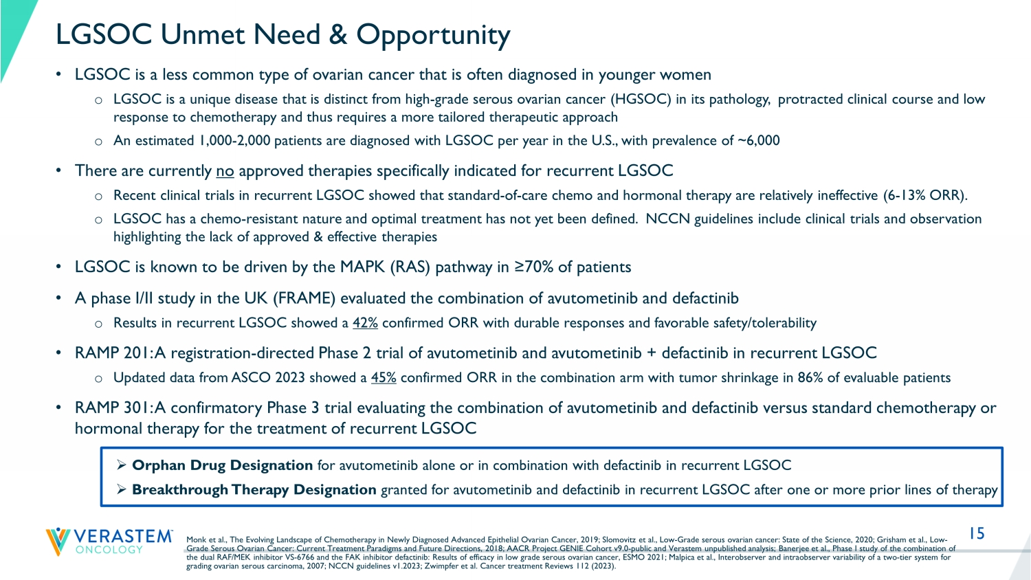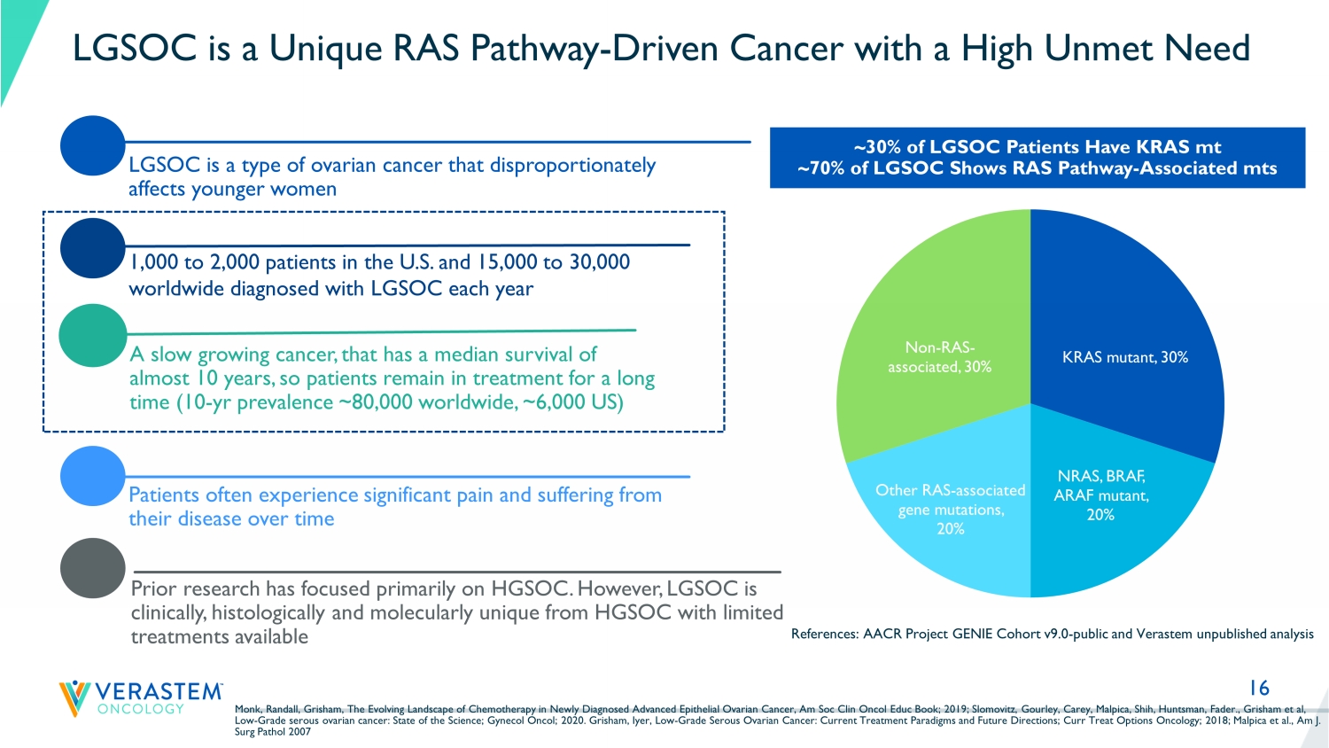 15 LGSOC Unmet Need & Opportunity • LGSOC is a less common type of ovarian cancer that is often diagnosed in younger women o LGSOC is a unique disease that is distinct from high - grade serous ovarian cancer (HGSOC) in its pathology, protracted clinical course and low response to chemotherapy and thus requires a more tailored therapeutic approach o An estimated 1,000 - 2,000 patients are diagnosed with LGSOC per year in the U.S., with prevalence of ~6,000 • There are currently no approved therapies specifically indicated for recurrent LGSOC o Recent clinical trials in recurrent LGSOC showed that standard - of - care chemo and hormonal therapy are relatively ineffective (6 - 13% ORR). o LGSOC has a chemo - resistant nature and optimal treatment has not yet been defined. NCCN guidelines include clinical trials and observation highlighting the lack of approved & effective therapies • LGSOC is known to be driven by the MAPK (RAS) pathway in ≥70% of patients • A phase I/II study in the UK (FRAME) evaluated the combination of avutometinib and defactinib o Results in recurrent LGSOC showed a 42% confirmed ORR with durable responses and favorable safety/tolerability • RAMP 201: A registration - directed Phase 2 trial of avutometinib and avutometinib + defactinib in recurrent LGSOC o Updated data from ASCO 2023 showed a 45% confirmed ORR in the combination arm with tumor shrinkage in 86% of evaluable patients • RAMP 301: A confirmatory Phase 3 trial evaluating the combination of avutometinib and defactinib versus standard chemotherapy or hormonal therapy for the treatment of recurrent LGSOC Monk et al., The Evolving Landscape of Chemotherapy in Newly Diagnosed Advanced Epithelial Ovarian Cancer, 2019; Slomovitz et al., Low - Grade serous ovarian cancer: State of the Science, 2020; Grisham et al., Low - Grade Serous Ovarian Cancer: Current Treatment Paradigms and Future Directions, 2018; AACR Project GENIE Cohort v9.0 - public and Verastem unpublished analysis; Banerjee et al., Phase I study of the combination of the dual RAF/MEK inhibitor VS - 6766 and the FAK inhibitor defactinib: Results of efficacy in low grade serous ovarian cancer, ESM O 2021; Malpica et al., Interobserver and intraobserver variability of a two - tier system for grading ovarian serous carcinoma, 2007; NCCN guidelines v1.2023; Zwimpfer et al. Cancer treatment Reviews 112 (2023). » Orphan Drug Designation for avutometinib alone or in combination with defactinib in recurrent LGSOC » Breakthrough Therapy Designation granted for avutometinib and defactinib in recurrent LGSOC after one or more prior lines of therapy