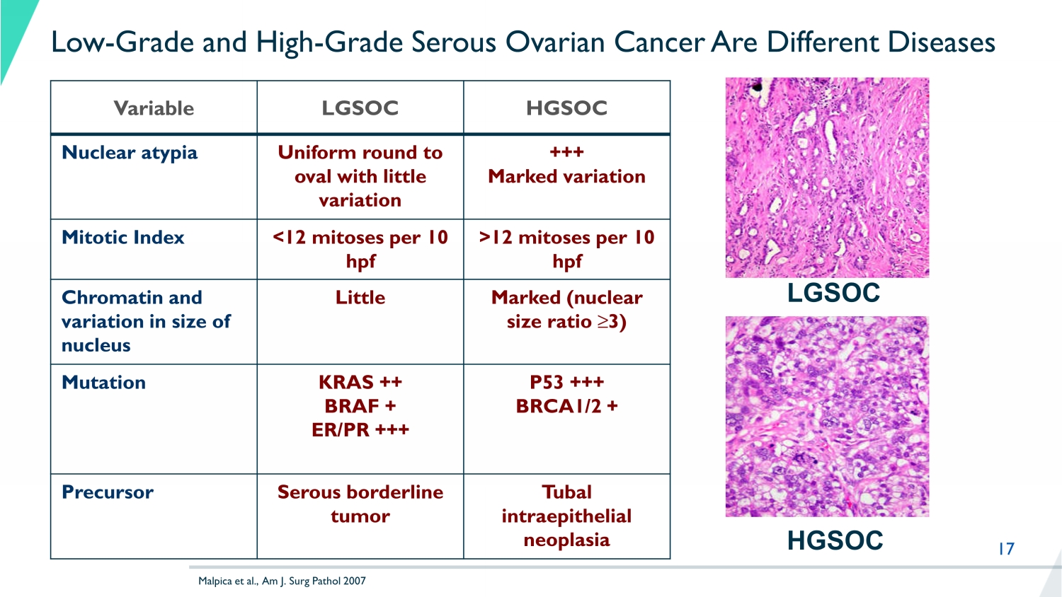 17 Low - Grade and High - Grade Serous Ovarian Cancer Are Different Diseases Variable LGSOC HGSOC Nuclear atypia Uniform round to oval with little variation +++ Marked variation Mitotic Index <12 mitoses per 10 hpf >12 mitoses per 10 hpf Chromatin and variation in size of nucleus Little Marked (nuclear size ratio ≥3) Mutation KRAS ++ BRAF + ER/PR +++ P53 +++ BRCA1/2 + Precursor Serous borderline tumor Tubal intraepithelial neoplasia LGSOC HGSOC Malpica et al., Am J. Surg Pathol 2007