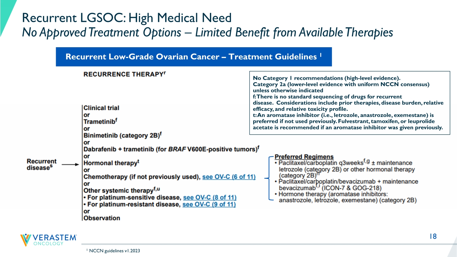 18 Recurrent LGSOC: High Medical Need No Approved Treatment Options – Limited Benefit from Available Therapies 1 NCCN guidelines v1.2023 No Category 1 recommendations (high - level evidence). Category 2a (lower - level evidence with uniform NCCN consensus) unless otherwise indicated f: There is no standard sequencing of drugs for recurrent disease. Considerations include prior therapies, disease burden, relative efficacy, and relative toxicity profile. t: An aromatase inhibitor (i.e., letrozole, anastrozole, exemestane) is preferred if not used previously. Fulvestrant, tamoxifen, or leuprolide acetate is recommended if an aromatase inhibitor was given previously. Recurrent Low - Grade Ovarian Cancer – Treatment Guidelines 1