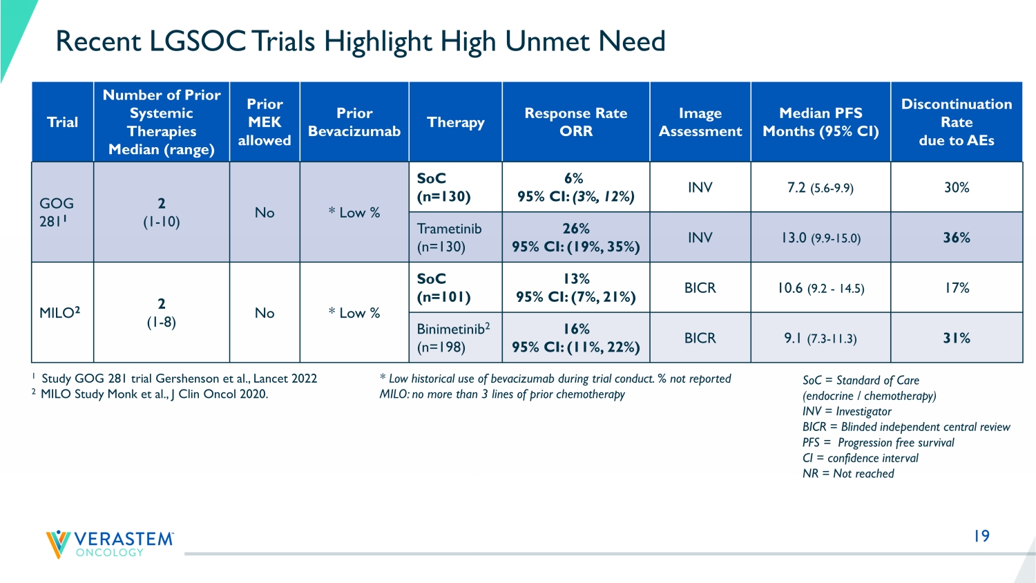 19 Recent LGSOC Trials Highlight High Unmet Need Trial Number of Prior Systemic Therapies Median (range) Prior MEK allowed Prior Bevacizumab Therapy Response Rate ORR Image Assessment Median PFS Months (95% CI) Discontinuation Rate due to AEs GOG 281 1 2 (1 - 10) No * Low % SoC (n=130) 6% 95% CI: (3%, 12%) INV 7.2 (5.6 - 9.9) 30% Trametinib (n=130) 26% 95% CI: (19%, 35%) INV 13.0 (9.9 - 15.0) 36% MILO 2 2 (1 - 8) No * Low % SoC (n=101) 13% 95% CI: (7%, 21%) BICR 10.6 (9.2 - 14.5) 17% Binimetinib 2 (n=198) 16% 95% CI: (11%, 22%) BICR 9.1 (7.3 - 11.3) 31% 1 Study GOG 281 trial Gershenson et al., Lancet 2022 2 MILO Study Monk et al., J Clin Oncol 2020. SoC = Standard of Care (endocrine / chemotherapy) INV = Investigator BICR = Blinded independent central review PFS = Progression free survival CI = confidence interval NR = Not reached * Low historical use of bevacizumab during trial conduct. % not reported MILO: no more than 3 lines of prior chemotherapy