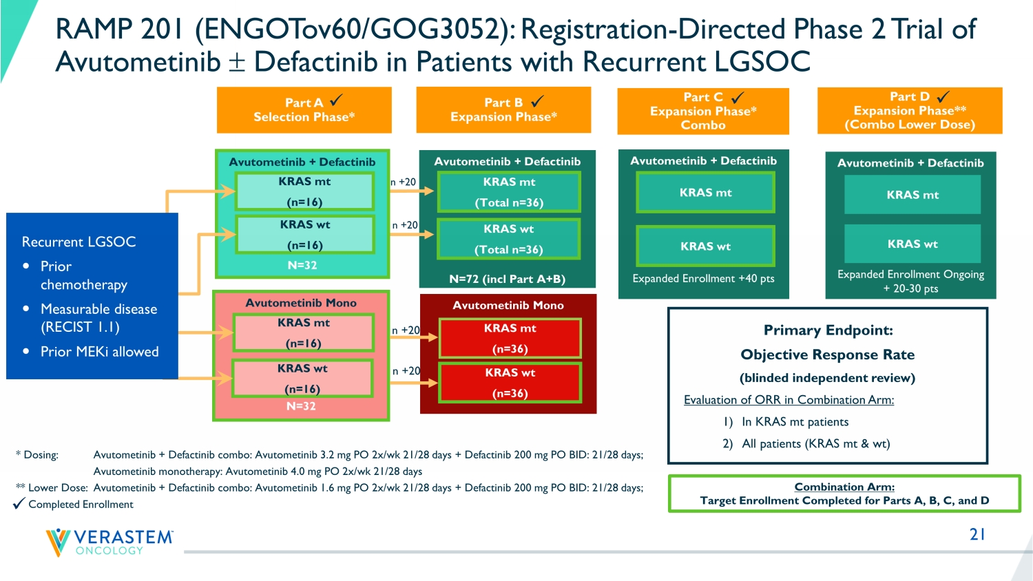 21 Avutometinib Mono N=72 (incl Part A + B) Avutometinib + Defactinib N=72 (incl Part A+B) Avutometinib + Defactinib N=32 * Dosing: Avutometinib + Defactinib combo: Avutometinib 3.2 mg PO 2x/wk 21/28 days + Defactinib 200 mg PO BID: 21/28 days; Avutometinib monotherapy: Avutometinib 4.0 mg PO 2x/wk 21/28 days ** Lower Dose: Avutometinib + Defactinib combo: Avutometinib 1.6 mg PO 2x/wk 21/28 days + Defactinib 200 mg PO BID: 21/28 days; Completed Enrollment KRAS mt (n=16) KRAS wt (n=16) Primary Endpoint: Objective Response Rate (blinded independent review) Evaluation of ORR in Combination Arm: 1) In KRAS mt patients 2) All patients (KRAS mt & wt) Avutometinib Mono N=32 KRAS mt (n=16) KRAS wt (n=16) KRAS mt (n=36) KRAS wt (n=36) KRAS mt ( Total n =36) KRAS wt ( Total n =36) Recurrent LGSOC Prior chemotherapy Measurable disease (RECIST 1.1) Prior MEKi allowed Combination Arm: Target Enrollment Completed for Parts A, B, C, and D ​ n +20 n +20 n +20 n +20 RAMP 201 (ENGOTov60/GOG3052): Registration - Directed Phase 2 Trial of Avutometinib Defactinib in Patients with Recurrent LGSOC Part A Selection Phase* Part B Expansion Phase* Avutometinib + Defactinib Expanded Enrollment +40 pts KRAS mt KRAS wt Part C Expansion Phase* Combo Part D Expansion Phase** (Combo Lower Dose) Avutometinib + Defactinib Expanded Enrollment Ongoing + 20 - 30 pts KRAS mt KRAS wt x x x x x