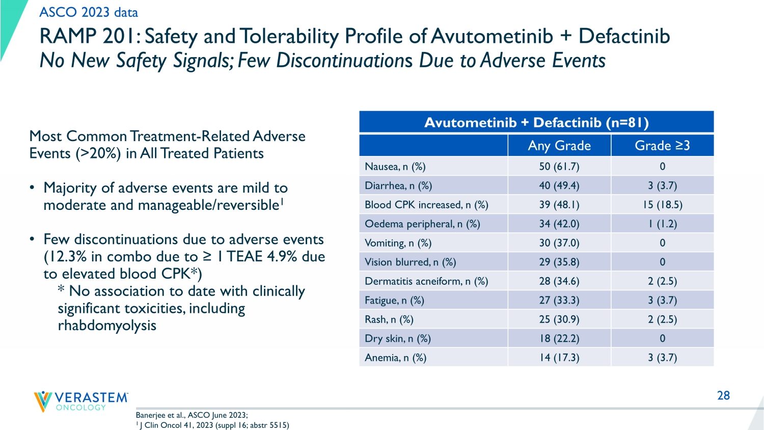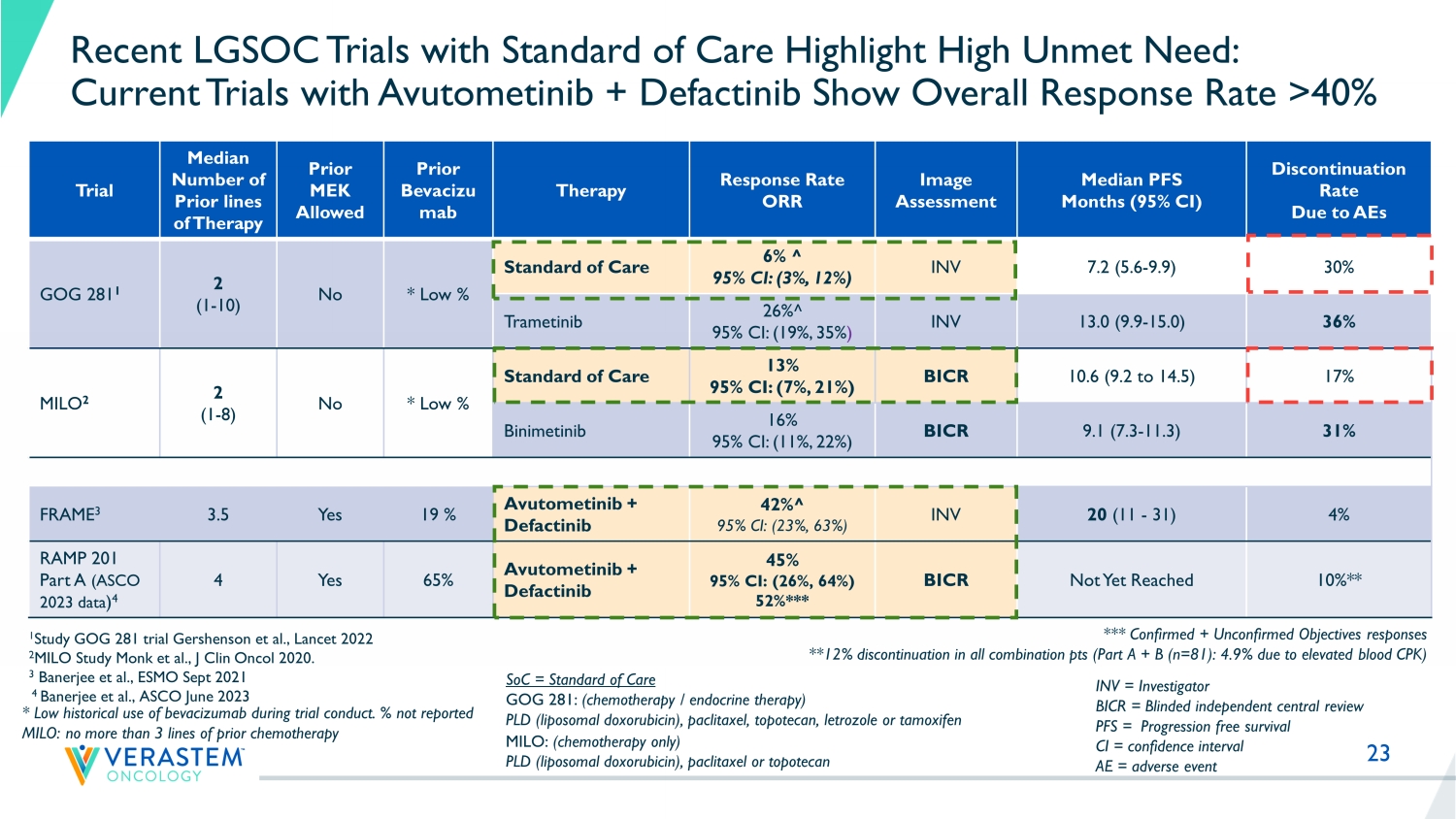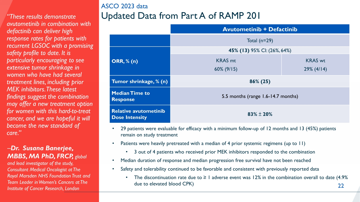 22 “These results demonstrate avutometinib in combination with defactinib can deliver high response rates for patients with recurrent LGSOC with a promising safety profile to date. It is particularly encouraging to see extensive tumor shrinkage in women who have had several treatment lines, including prior MEK inhibitors. These latest findings suggest the combination may offer a new treatment option for women with this hard - to - treat cancer, and we are hopeful it will become the new standard of care.” – Dr. Susana Banerjee, MBBS, MA PhD, FRCP, global and lead investigator of the study, Consultant Medical Oncologist at The Royal Marsden NHS Foundation Trust and Team Leader in Women’s Cancers at The Institute of Cancer Research, London Updated Data from Part A of RAMP 201 ASCO 2023 data Avutometinib + Defactinib Total (n=29) ORR, % (n) 45% (13) 95% CI: (26%, 64%) KRAS mt 60% (9/15) KRAS wt 29% (4/14) Tumor shrinkage , % (n) 86% (25) Median Time to Response 5.5 months (range 1.6 - 14.7 months) Relative avutometinib Dose Intensity 83% ± 20% • 29 patients were evaluable for efficacy with a minimum follow - up of 12 months and 13 (45%) patients remain on study treatment • P atients were heavily pretreated with a median of 4 prior systemic regimens (up to 11) • 3 out of 4 patients who received prior MEK inhibitors responded to the combination • Median duration of response and median progression free survival have not been reached • Safety and tolerability continued to be favorable and consistent with previously reported data • The discontinuation rate due to ≥ 1 adverse event was 12% in the combination overall to date (4.9% due to elevated blood CPK)