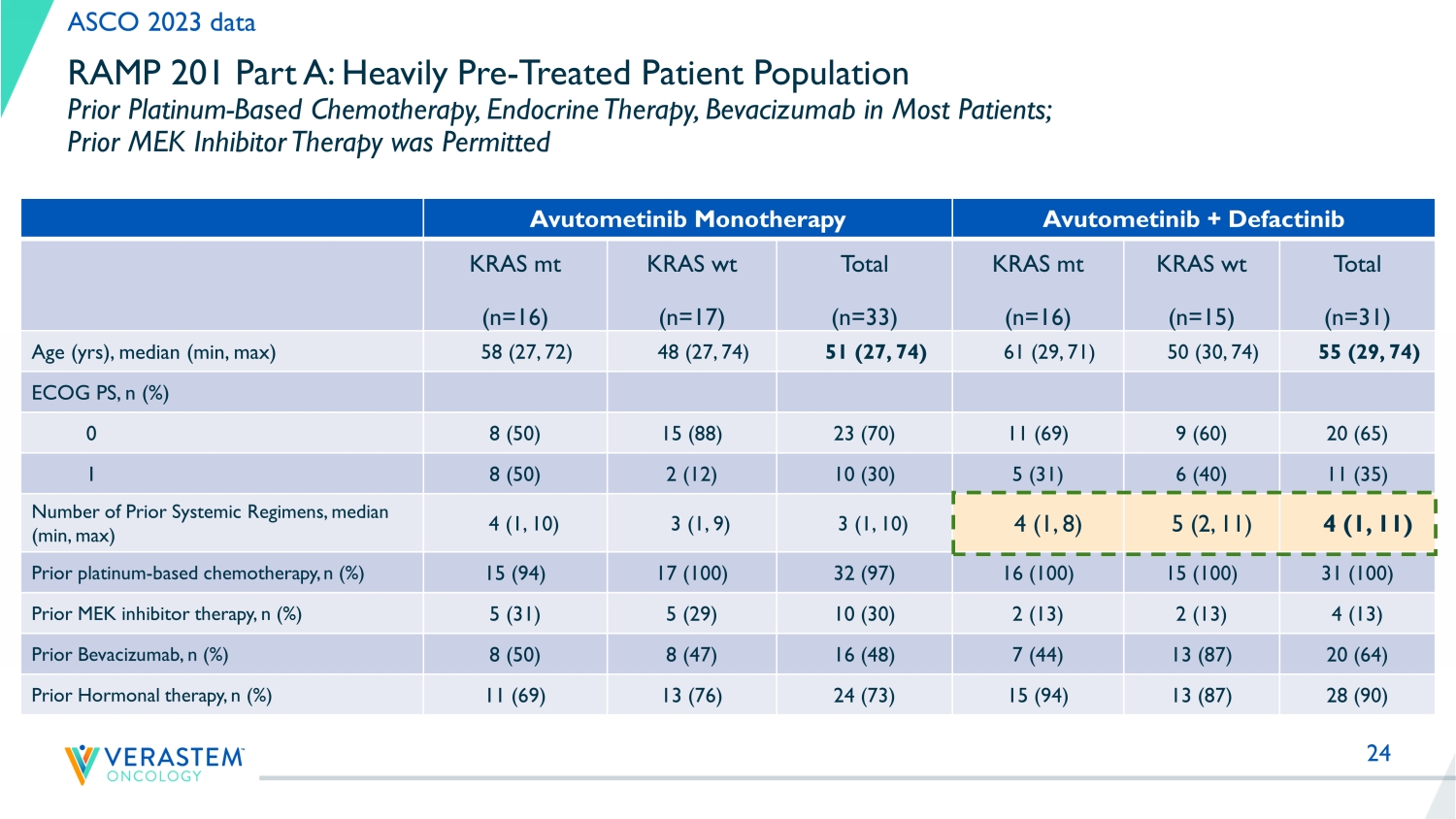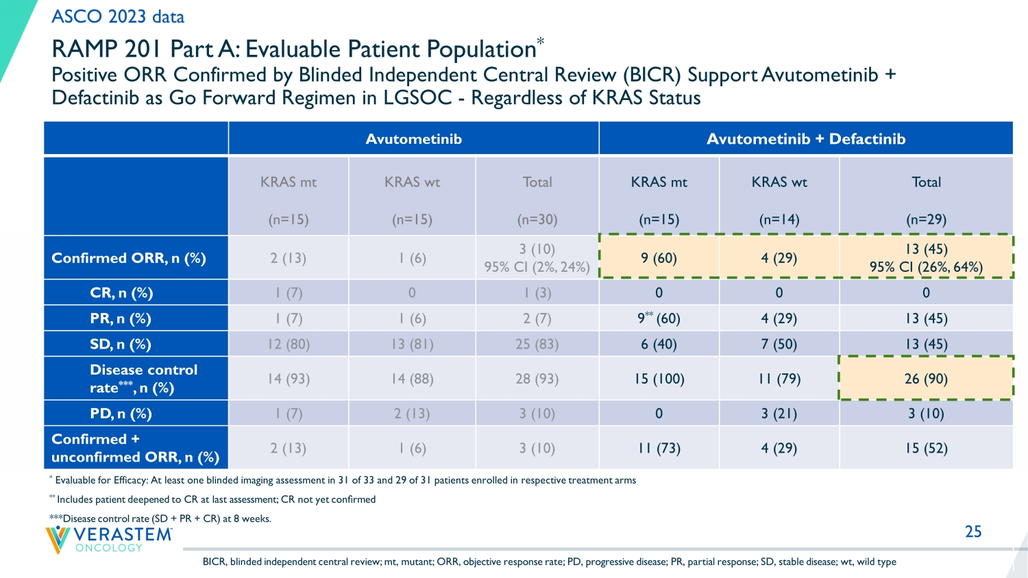 24 RAMP 201 Part A: Heavily Pre - Treated Patient Population Prior Platinum - Based Chemotherapy, Endocrine Therapy, Bevacizumab in Most Patients; Prior MEK Inhibitor Therapy was Permitted Avutometinib Monotherapy Avutometinib + Defactinib KRAS mt (n=16) KRAS wt (n=17) Total (n=33) KRAS mt (n=16) KRAS wt (n=15) Total (n=31) Age (yrs), median (min, max) 58 (27, 72) 48 (27, 74) 51 (27, 74) 61 (29, 71) 50 (30, 74) 55 (29, 74) ECOG PS, n (%) 0 8 (50) 15 (88) 23 (70) 11 (69) 9 (60) 20 (65) 1 8 (50) 2 (12) 10 (30) 5 (31) 6 (40) 11 (35) Number of Prior Systemic Regimens, median (min, max) 4 (1, 10) 3 (1, 9) 3 (1, 10) 4 (1, 8) 5 (2, 11) 4 (1, 11) Prior platinum - based chemotherapy, n (%) 15 (94) 17 (100) 32 (97) 16 (100) 15 (100) 31 (100) Prior MEK inhibitor therapy, n (%) 5 (31) 5 (29) 10 (30) 2 (13) 2 (13) 4 (13) Prior Bevacizumab, n (%) 8 (50) 8 (47) 16 (48) 7 (44) 13 (87) 20 (64) Prior Hormonal therapy, n (%) 11 (69) 13 (76) 24 (73) 15 (94) 13 (87) 28 (90) ASCO 2023 data