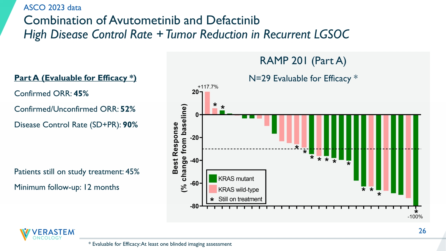 25 RAMP 201 Part A: Evaluable Patient Population * Positive ORR Confirmed by Blinded Independent Central Review (BICR) Support Avutometinib + Defactinib as Go Forward Regimen in LGSOC - Regardless of KRAS Status Avutometinib Avutometinib + Defactinib KRAS mt (n=15) KRAS wt (n=15) Total (n=30) KRAS mt (n=15) KRAS wt (n=14) Total (n=29) Confirmed ORR, n (%) 2 (13) 1 (6) 3 (10) 95% CI (2%, 24%) 9 (60) 4 (29) 13 (45) 95% CI (26%, 64%) CR, n (%) 1 (7) 0 1 (3) 0 0 0 PR, n (%) 1 (7) 1 (6) 2 (7) 9 ** (60) 4 (29) 13 (45) SD, n (%) 12 (80) 13 (81) 25 (83) 6 (40) 7 (50) 13 (45) Disease control rate *** , n (%) 14 (93) 14 (88) 28 (93) 15 (100) 11 (79) 26 (90) PD, n (%) 1 (7) 2 (13) 3 (10) 0 3 (21) 3 (10) Confirmed + unconfirmed ORR, n (%) 2 (13) 1 (6) 3 (10) 11 (73) 4 (29) 15 (52) * Evaluable for Efficacy: At least one blinded imaging assessment in 31 of 33 and 29 of 31 patients enrolled in respective trea tm ent arms ** Includes patient deepened to CR at last assessment; CR not yet confirmed *** Disease control rate (SD + PR + CR) at 8 weeks. ASCO 2023 data BICR, blinded independent central review; mt, mutant; ORR, objective response rate; PD, progressive disease; PR, partial response; SD, stable disease; wt , wild type