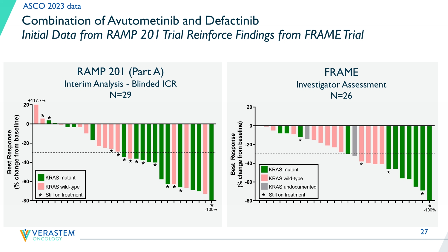 26 Combination of Avutometinib and Defactinib High Disease Control Rate + Tumor Reduction in Recurrent LGSOC Part A (Evaluable for Efficacy *) Confirmed ORR: 45% Confirmed/Unconfirmed ORR: 52% Disease Control Rate (SD+PR): 90% Patients still on study treatment: 45% Minimum follow - up: 12 months RAMP 201 (Part A) N=29 Evaluable for Efficacy * * Evaluable for Efficacy: At least one blinded imaging assessment ASCO 2023 data -80 -60 -40 -20 0 20 B e s t R e s p o n s e ( % c h a n g e f r o m b a s e l i n e ) * * * * * * * * * * * * * +117.7% -100% KRAS mutant KRAS wild-type Still on treatment *