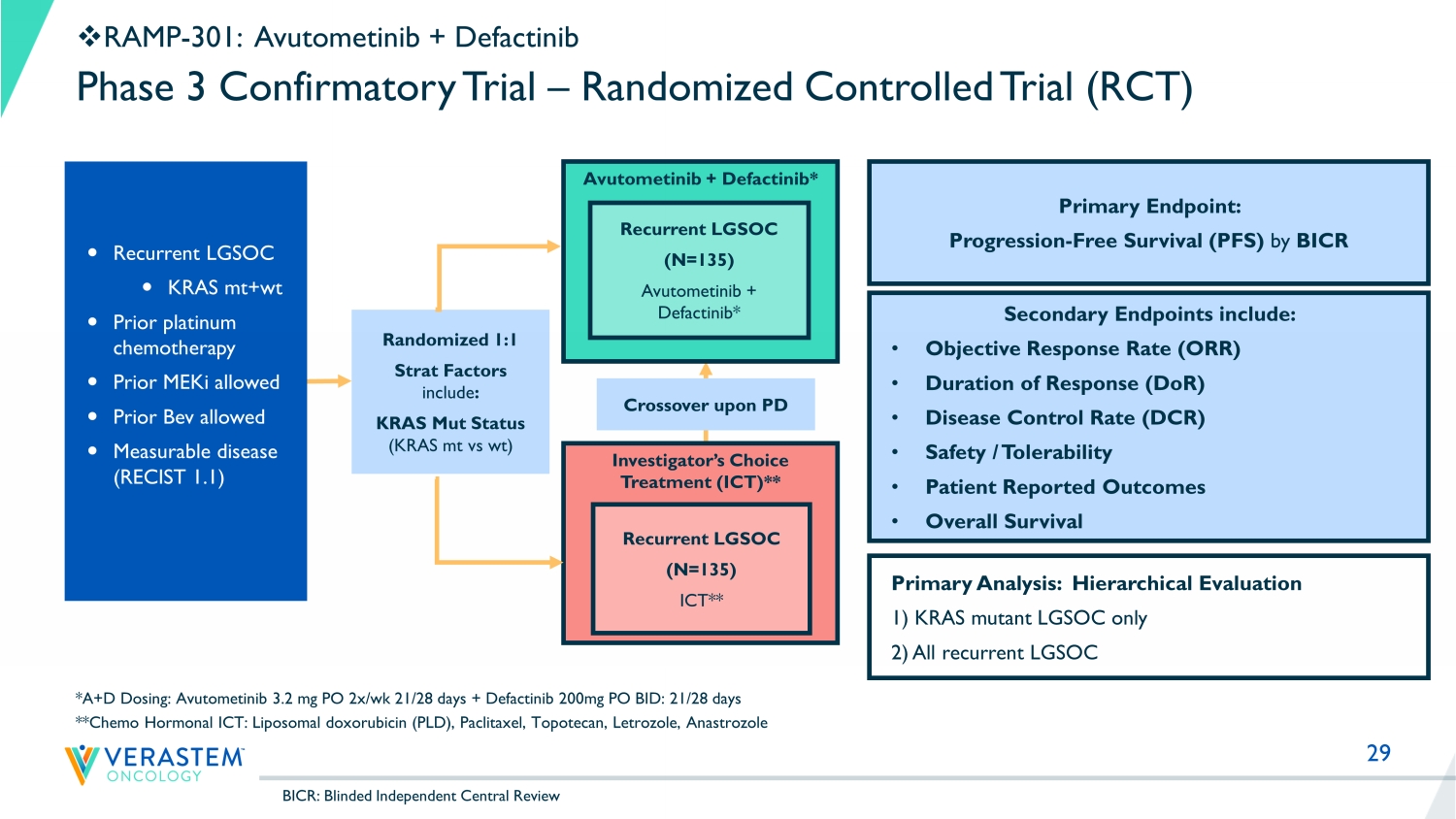 29 Phase 3 Confirmatory Trial – Randomized Controlled Trial (RCT) □ RAMP - 301: Avutometinib + Defactinib Recurrent LGSOC KRAS mt+wt Prior platinum chemotherapy Prior MEKi allowed Prior Bev allowed Measurable disease (RECIST 1.1) *A+D Dosing: Avutometinib 3.2 mg PO 2x/ wk 21/28 days + Defactinib 200mg PO BID: 21/28 days **Chemo Hormonal ICT: Liposomal doxorubicin (PLD), Paclitaxel, Topotecan, Letrozole, Anastrozole Randomized 1:1 Strat Factors include : KRAS Mut Status (KRAS mt vs wt) Avutometinib + Defactinib* Investigator’s Choice Treatment (ICT)** Recurrent LGSOC (N= 135 ) Avutometinib + Defactinib* Recurrent LGSOC (N= 135 ) ICT ** Crossover upon PD Primary Endpoint: Progression - Free Survival (PFS) by BICR Secondary Endpoints include: • Objective Response Rate (ORR) • Duration of Response (DoR) • Disease Control Rate (DCR) • Safety / Tolerability • Patient Reported Outcomes • Overall Survival Primary Analysis: Hierarchical Evaluation 1) KRAS mutant LGSOC only 2) All recurrent LGSOC BICR: Blinded Independent Central Review